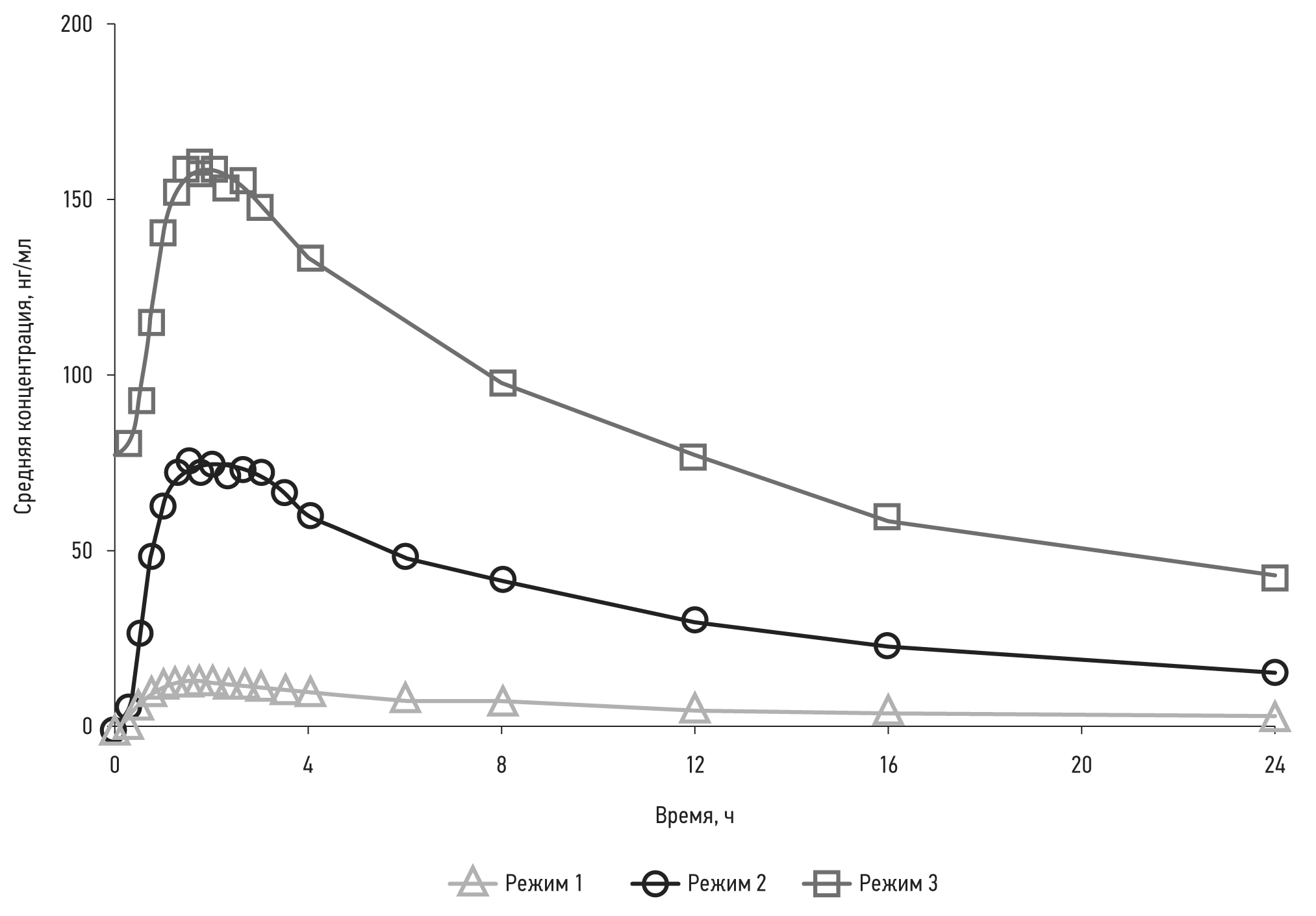 Рис. 3. Средняя концентрация хифенадина (Фенкарол) в различных режимах приёма: режим 1 ― однократный пероральный приём дозы 10 мг; режим 2 ― однократный пероральный приём дозы 50 мг; режим 3 ― пероральный приём одной таблетки 50 мг с 200 мл воды при условии приёма внутрь 2 раза в день в течение 4 дней (приём препарата продолжался до утра пятого дня, всего 9 доз). Адаптировано из [21]. / Fig. 3. The average concentration of the drug in different modes of taking the drug. Mode 1 ― a single oral dose of 10 mg of hifenadine (Fencarol); mode 2 ― a single oral dose of hifenadine (Fencarol) at a dose of 50 mg; mode 3 ― oral intake of one tablet of 50 mg with 200 ml of water, provided ingestion twice a day for four days (Taking the drug lasted until the morning of the fifth day, 9 doses in total). Adapted from [21].