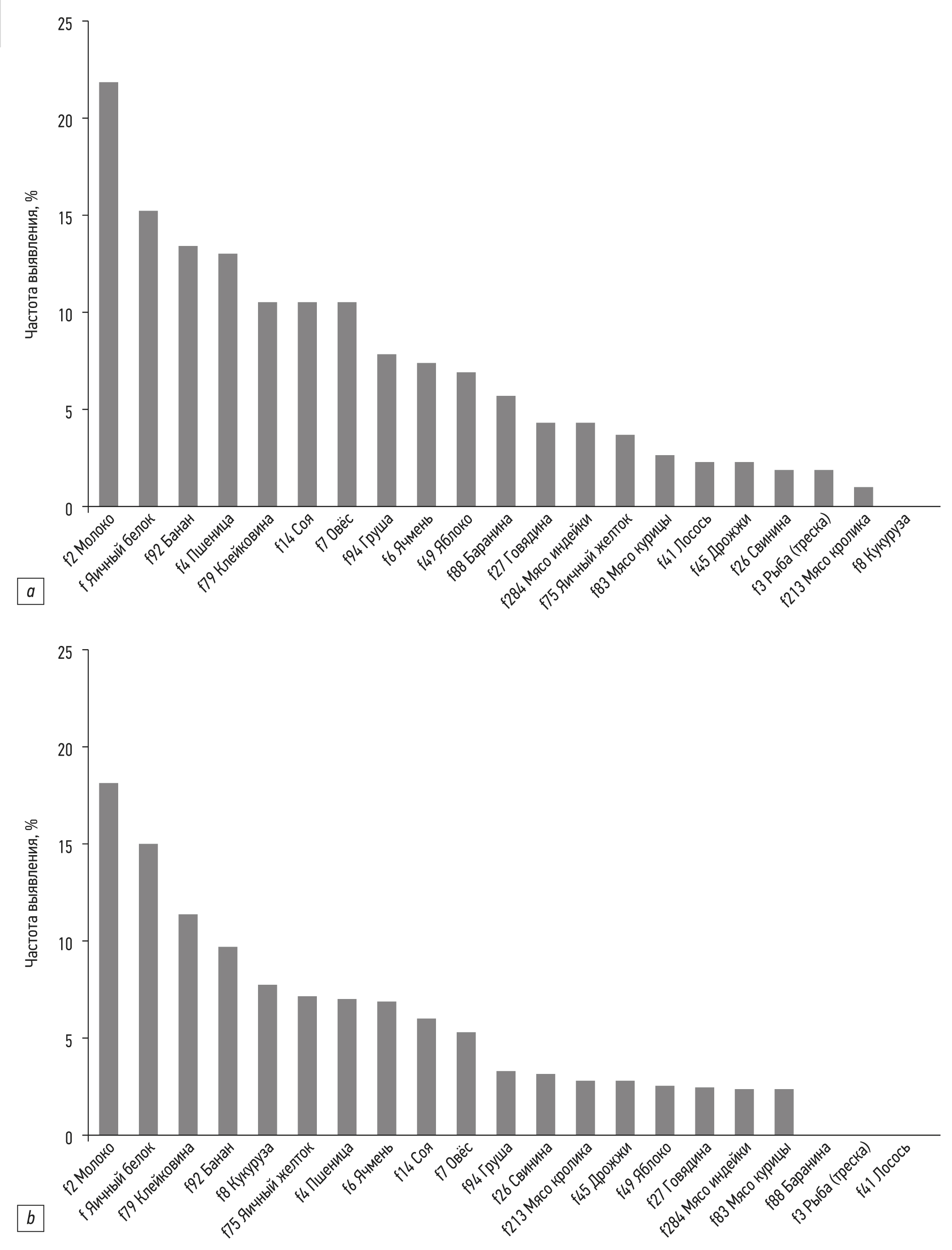 Рис. 1. Частота выявления аллергенспецифических IgE к наиболее распространённым аллергенам у всех детей с врождённым буллёзным эпидермолизом: a ― при дистрофической форме; b ― при простой форме.