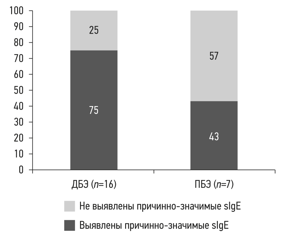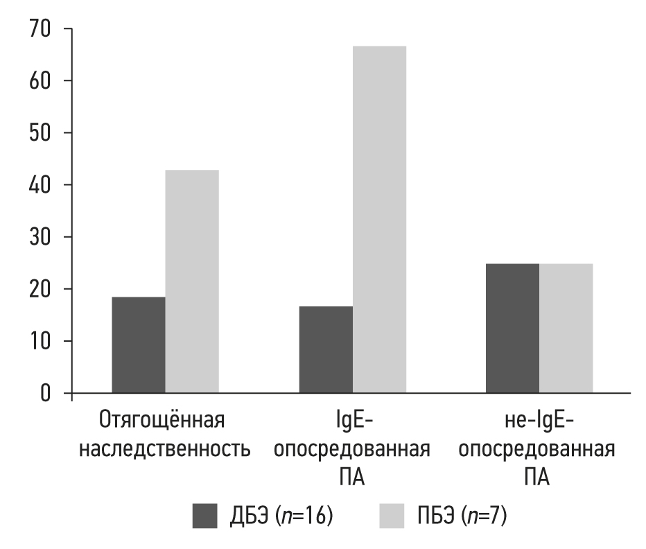 У детей с ДБЭ в большинстве случаев выявлялись IgE к причинно-значимым пищевым белкам, участвующим в развитии пищевой аллергии, тогда как для группы с ПБЭ была характерна не-IgE-опосредованная форма пищевой аллергии (рис. 2) (р=0,34262).
