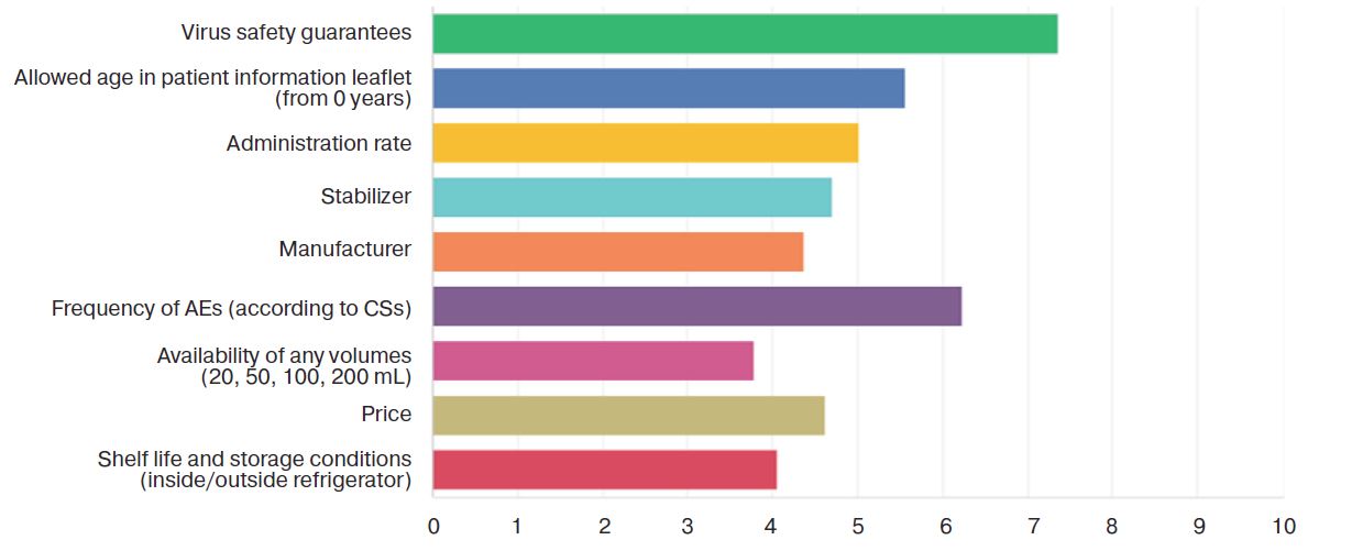 Switching from IVIG efficacy questions to safety aspects, it should be noted that safety and tolerance of IVIG depend on qualitative elimination of pathogens and removal of impurities which may cause the side effects. Taking into account that all normal human immunoglobulin products are blood products, they are associated with the risk of transmission of infections, thus, WHO’s compulsory requirement is virus safety assurance [40]. This parameter has been also highlighted by Russian allergists-immunologists (Figure 1) as the most priority feature in choice of IVIG (the survey was performed on independent platform for anonymous voting “survey monkey” and included 86 respondents of the members of Russian Association of Allergists and Clinical Immunologists prescribing therapy with IVIG).