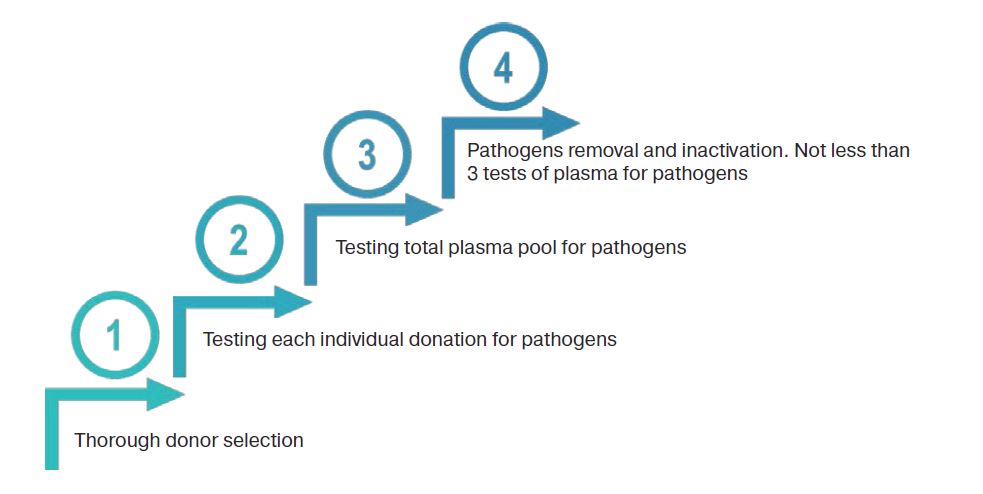During manufacture process of modern IVIG products they undergo complex multi-step process to achieve virus safety (Figure 2). At step 1, the selection of donors includes physical examination and collection of history to exclude donors with risk of infectious diseases. Step 2 is the examination of each donation for HIV, hepatitis B and C viruses using valid laboratory tests. All samples with confirmed presence of at least one pathogen are excluded from further manufacture. At the third step, the whole plasma pool is tested before the manufacturing process starts. To achieve effective elimination of virus, not less than 3 steps of inactivation and elimination of viruses are used, which differ in different manufacturers. Used methods should be effective against both enveloped viruses (e.g., HIV, hepatitis B virus, hepatitis C virus) and non-enveloped viruses (e.g., parvovirus B19, hepatitis A virus) [41]. Product batches are multiply tested for virus safety during the whole manufacturing process.