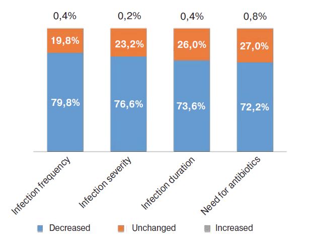 One of the first IVIG products meeting all listed requirements both worldwide and in Russia was Octagam 5% authorized in 1995 (10% product solution was authorized in 2011). There is large experience with Octagam in both patients with PID and SID at low therapeutic doses and patients requiring high dose treatment regimen. In 2014, the results of almost 20-year observation of this product efficacy in real clinical practice in patients with primary and secondary immunodeficiencies were published. The study included 363 patients with different forms of PID. The results demonstrated decrease in frequency of infectious diseases practically by 80%, severity of infectious diseases practically by 76.6%, period of infectious diseases by 73.6%, need for antibacterial therapy by 72.2% (Figure 3). The results made clear the significance of replacement therapy with IVIG in respect of treatment of patients. The value of the study is large patient sample (PIDs are orphan diseases, thus, studies on large sample are sporadic). Besides, importance is being increasingly attached to data obtained in real clinical practice, when not “ideal” patients but patients of all ages with comorbid conditions are evaluated, which is not always possible during clinical trials [55].