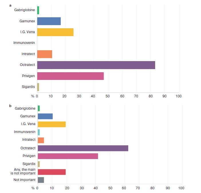 Long-term experience with Octagam and Octagam 10% in the Russian Federation also resulted in high evaluation of efficacy/safety profile of these products according to allergist-immunologists (the survey was performed on independent platform for anonymous voting survey monkey and included 86 respondents of the members of RAACI prescribing therapy with IVIG) (Figures 4 a and b).