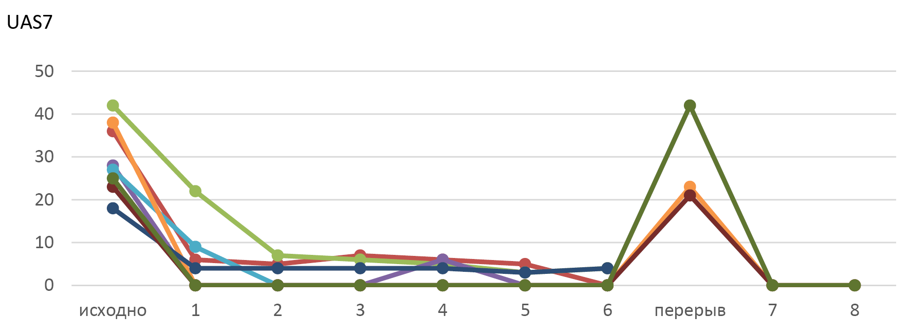 В последующем 4 (50%) пациента из этой группы после 3–4-й инъекции омализумаба прекратили полностью прием антигистаминных средств при сохранении контроля заболевания. Кроме того, в I группе следует выделить 2 (25%) пациентов, у которых после инъекции омализумаба симптомы крапивницы исчезали полностью, однако к концу третьей недели отмечалось появление единичных уртикарных элементов, при этом степень активности заболевания по шкале UAS7 была ниже по сравнению с исходными значениями.