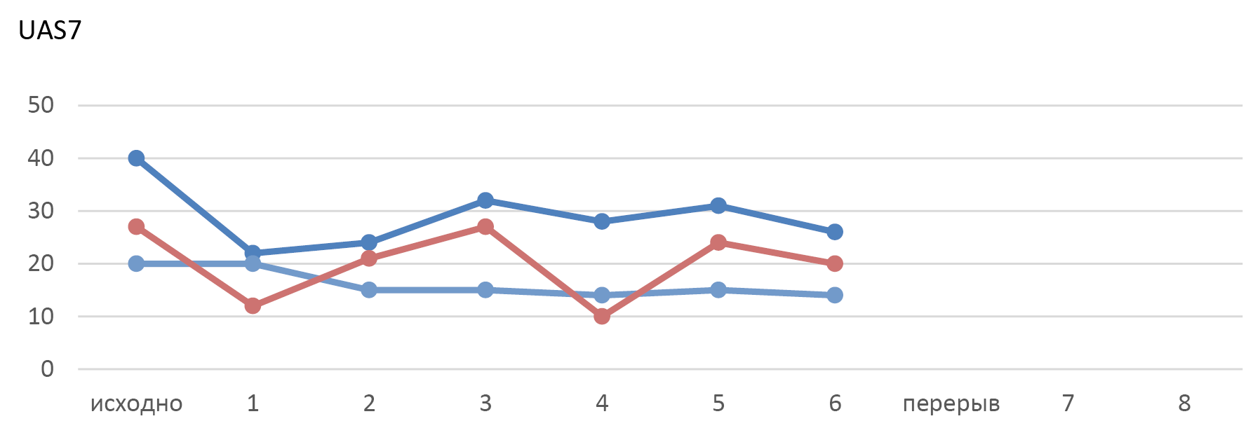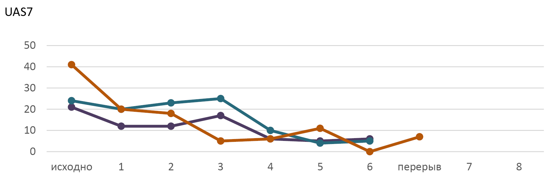 Отсроченный положительный эффект на введение омализумаба наблюдался у 3 (21,4%) пациентов, которые составили II группу наблюдения (рис. 1, 3). Клинической особенностью течения заболевания у этих пациентов являлось отсутствие контроля над симптомами ХСК после первой инъекции препарата, зудящие уртикарные элементы сохранялись, однако после введения 4–5-й дозы омализумаба их количество и интенсивность кожного зуда уменьшились, а показатели степени активности по шкале UAS7 снизились более чем на 50% по сравнению с исходными значениями и варьировались в пределах от 3 до 14 баллов. Системные ГКС у пациентов II группы были отменены, двум больным удалось снизить дозировку АГП2 до терапевтической. Необходимо отметить, что у одного пациента после шестой инъекции омализумаба симптомы крапивницы были полностью купированы, наблюдалась ремиссия заболевания (см. рис. 3).
