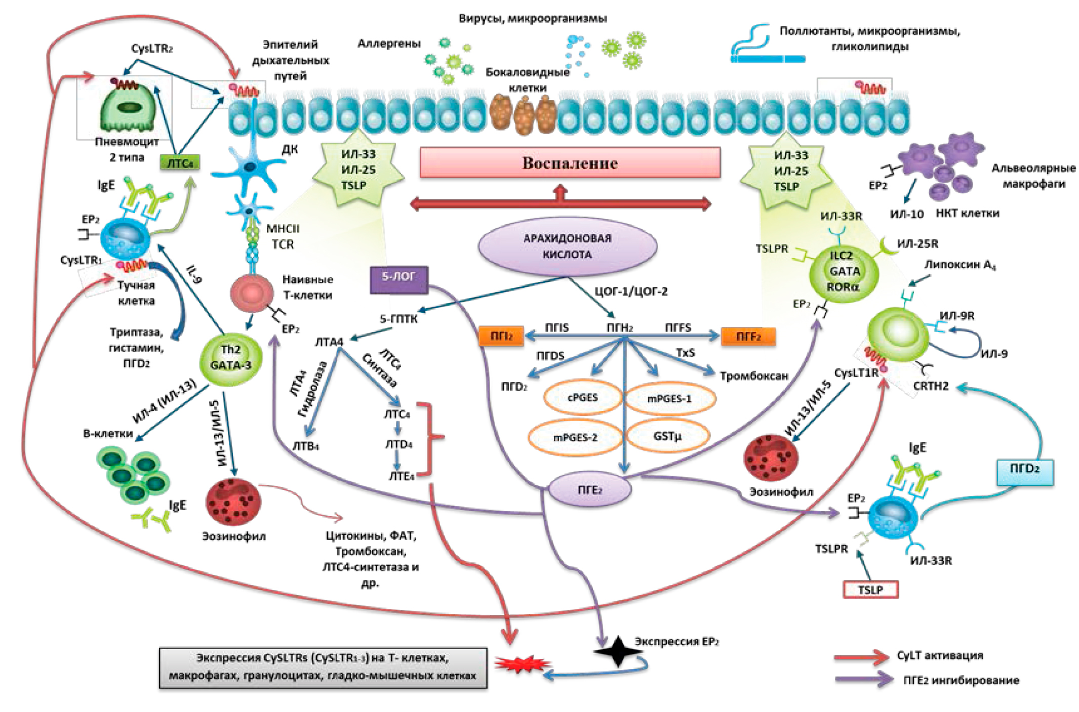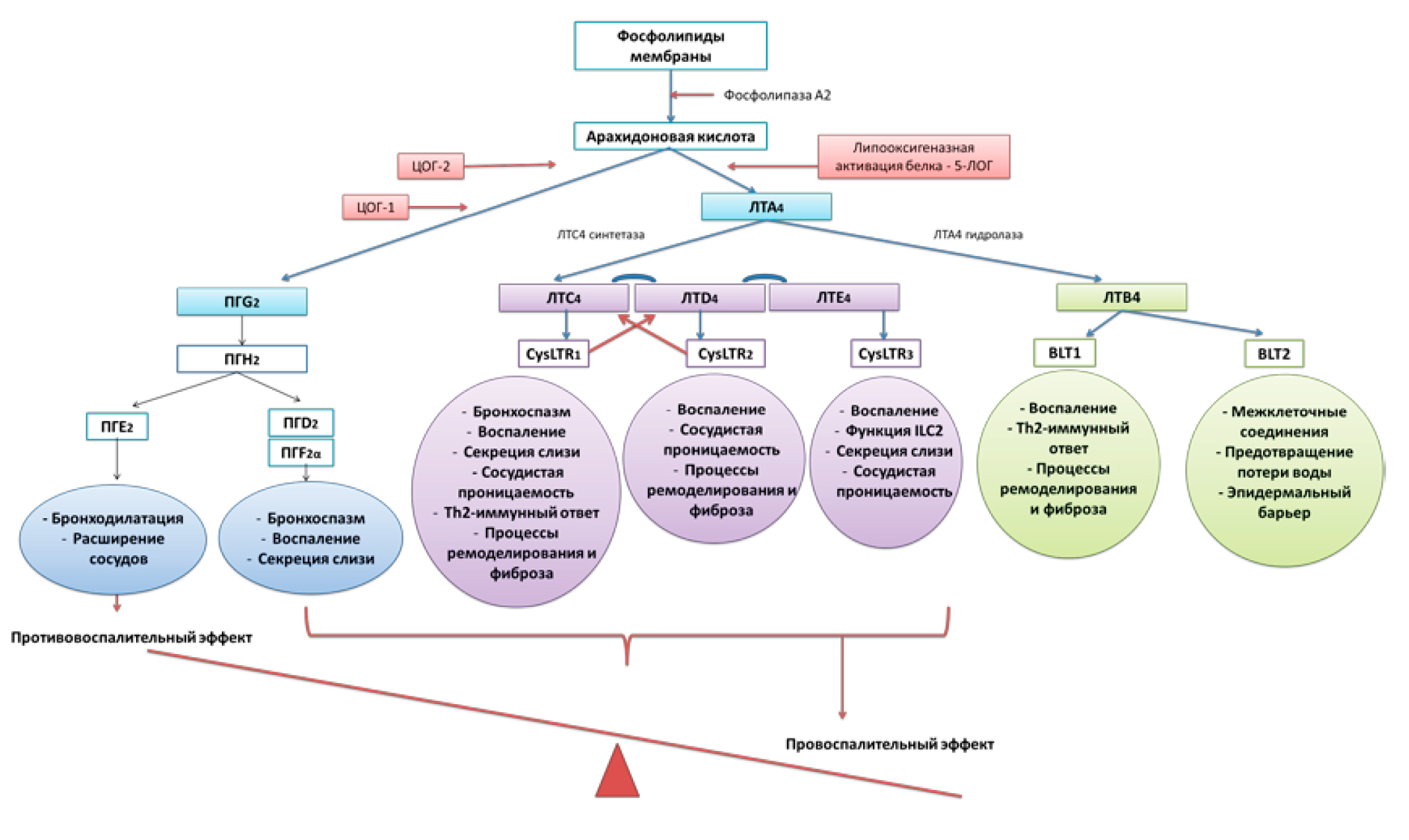 Арахидоновая кислота (АК) входит в состав глицерофосфолипидов мембран. Под действием ассоциированной с мембраной фосфолипазы А2 эйкозатетраеновая кислота отщепляется от глицерофосфолипида и метаболизируется тремя основными путями: циклооксигеназным, липоксигеназным и цитохромным (монооксигеназным). Циклооксигеназа (ЦОГ) является ферментом, расщепляющим АК до простагландинов (ПГ) и тромбоксанов. Продуктами 5-липокосигеназного (5-ЛОГ) пути превращения АК являются цистениловые лейкотриены, такие как ЛТC4, ЛТD4, ЛТE4. Они являются мощными провоспалительными медиаторами и могут способствовать миграции эозинофилов в дыхательные пути, вызывать бронхоконстрикцию, секрецию слизи и отек слизистой оболочки дыхательных путей [12]. Другие продукты липоксигеназного превращения АК известны как потенциальные хемотаксические агенты и секретолитики (рис. 1).