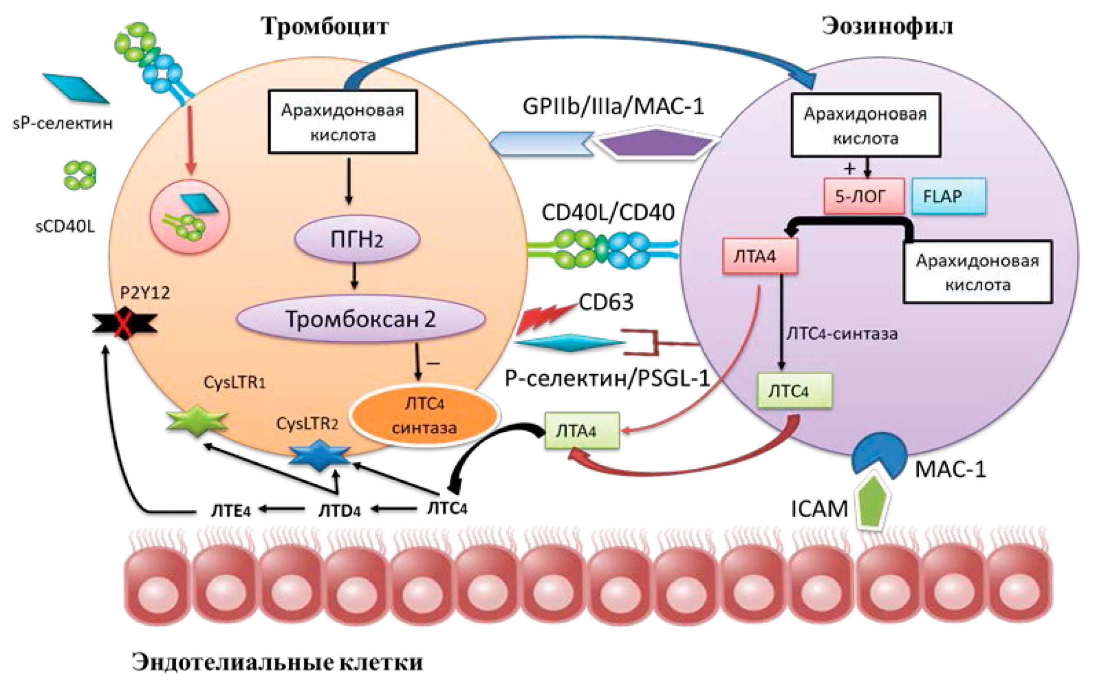Рис. 2. Сигнальные каскады, вовлеченные во взаимоотношения между тромбоцитами и эозинофилами. Адаптировано по [1]. ПГ – простагландины; ЛТ – лейкотриены; 5-ЛОГ – 5-липооксигеназа; MAC-1 – макрофаг-1 антиген (мембранный белок, гетеродимерный интегрин); CysLTR1, CysLTR2 – рецепторы цистеиниловых лейкотриенов; P2Y12 – хеморецептор для аденозиндифосфата, который относится к классу GI группы связанных с белком G пуринергических рецепторов; GPIIb/IIIa – интегриновый рецептор тромбоцитов; FLAP – 5-липооксигеназный активирующий белок