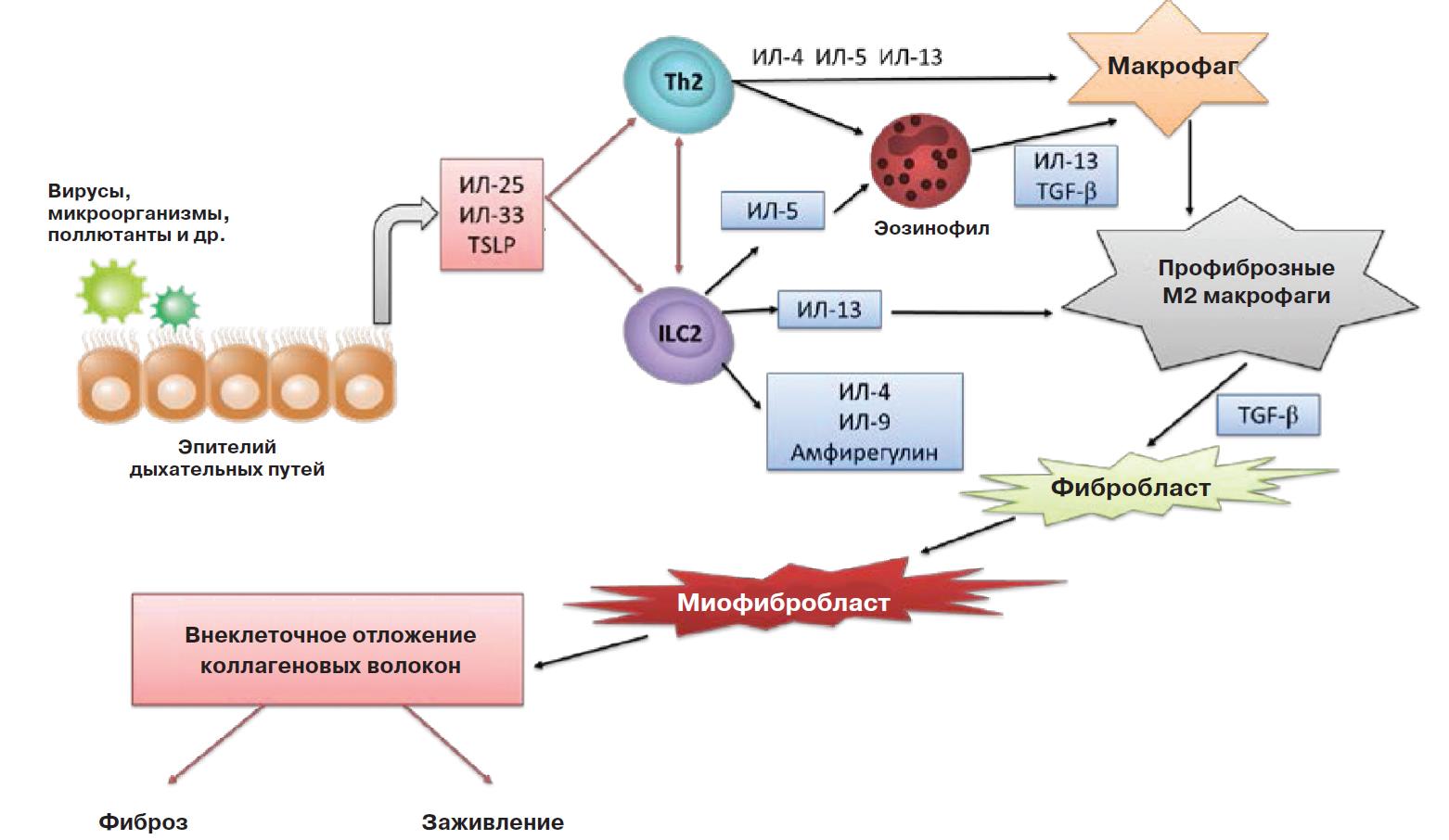 ИЛ-9 – это фактор роста тучных клеток, который также стимулирует ИЛ-4-индуцированную продукцию антител в B-клетках. Кроме того, аутокринное действие ИЛ-9 способствует повышению выживаемости Т-хелперов 2-го типа (Th2) и стимулирует их к продукции цитокинов Т2-профиля, что приводит к усилению эозинофильного воспаления [28]. ИЛ-13 индуцирует переключение секреции иммуноглобулинов в B-клетках с IgM на IgE, способствует увеличению выживаемости тучных клеток, усилению ремоделирования стенок бронхов и повышению проницаемости бронхиального эпителия. ИЛ-13 также участвует в повышении тканевой представленности эозинофилов за счет лучшей их адгезии к эндотелию сосудов и пенетрации в ткани, не оказывая при этом значимого влияния на развитие системной эозинофилии в отличие от ИЛ-5 [29]. ИЛ-13 способен активировать макрофаги в профибротический фенотип, а также индуцировать осаждение коллагена из фибробластов [29, 30].