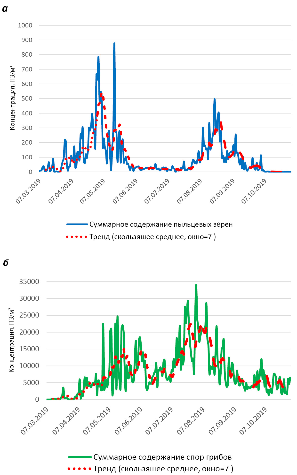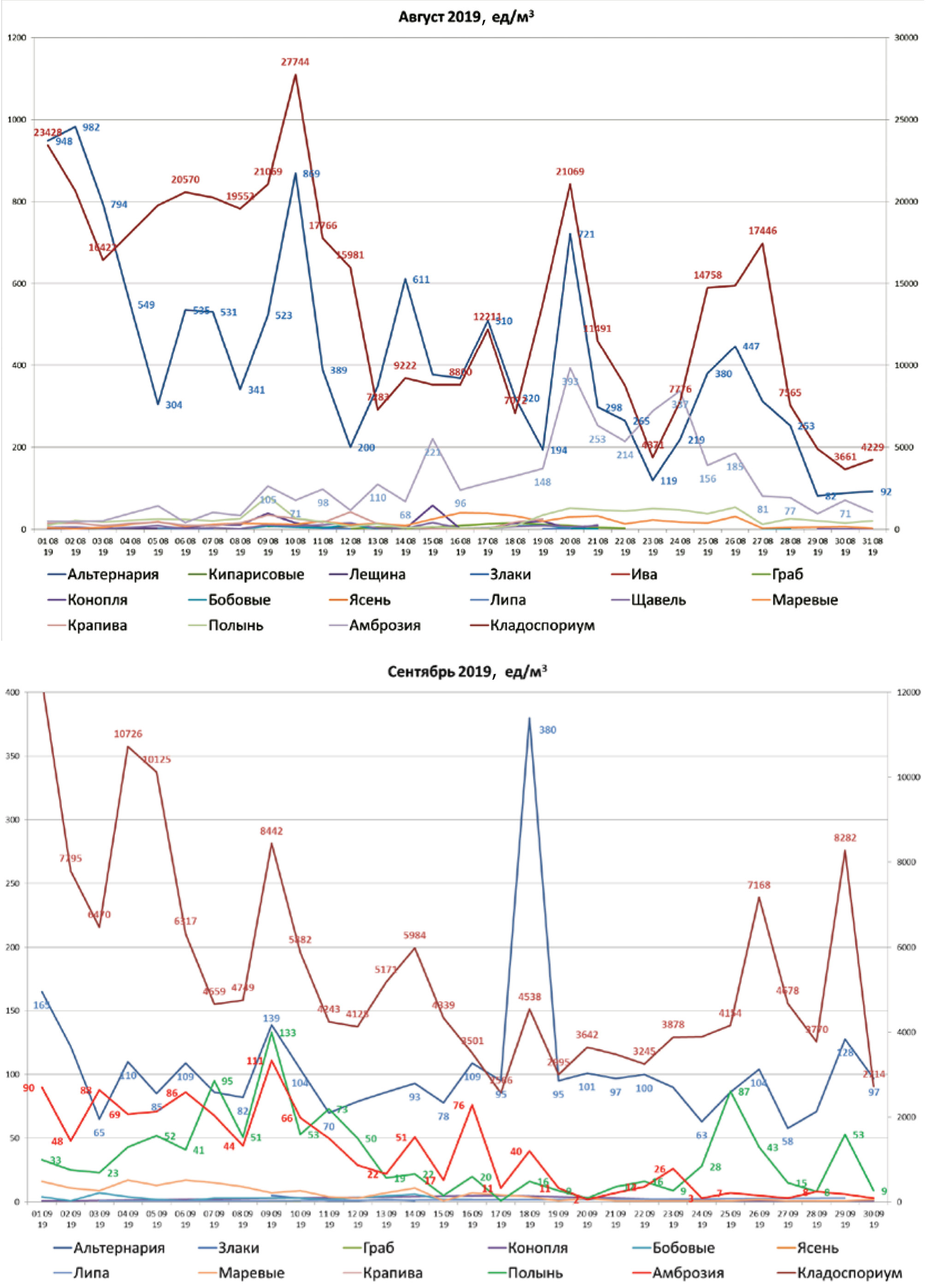 Результаты мониторинга аэроаллергенов по месяцам наблюдения за 2019 г. в Ростове-на-Дону представлены следующим образом. Изменение концентрации пыльцы (скользящее среднее значение единиц ПЗ/м3) в марте: доминировали тополь (160 ПЗ/м3), вяз (61 ПЗ/м3), ольха (57 ПЗ/м3), обнаружены единичные ПЗ клена, кипарисовых, лещины, березы. При этом концентрация ПЗ значительно менее выражена в сравнении с таковой спор плесневых грибов: кладоспориум (3526 ед/м3), альтернарии (20 ед/м3). В апреле: преобладание палинации тополя (597 ПЗ/м3); активировались орешник (83 ПЗ/м3), кипарисовые (61 ПЗ/м3), клен (58 ПЗ/м3); отмечены максимальные значения концентрации ПЗ березы (36 ПЗ/м3); зарегистрированы единичные зерна щавеля, шелковицы, сосны. Концентрация спор грибов продолжала расти: кладоспориум (7328 ед/м3), альтернария (237 ед/м3). В мае: наблюдаются максимальные значения концентрации ПЗ шелковицы (459 ПЗ/м3), отмечен рост концентрации крапивы (269 ПЗ/м3), – зерна которой с периодическим подъемом и падением наблюдали до октября, а также вяза (374 ПЗ/м3 с последующим снижением концентрации), щавеля (265 ПЗ/м3), сосны (51 ПЗ/м3), ели (48 ПЗ/м3), маревых (65 ПЗ/м3), подорожника (97 ПЗ/м3). Продолжала расти концентрация спор кладоспориума (24 510 ед/м3), альтернарии (618 ед/м3). В июне наблюдали продолжение палинации луговых и злаковых: крапива (44 ПЗ/м3), щавель (22 ПЗ/м3), маревые (13 ПЗ/м3), единичные зерна злаковых. При этом продолжается регистрация единичных ПЗ деревьев (клен, ольха, береза). По-прежнему высокие и нарастающие концентрации спор грибов: кладоспориум (18 227 ед/м3), альтернарии (569 ед/м3). В июле: в пик цветения луговых и злаковых трав доминирует концентрация ПЗ крапивы (41 ПЗ/м3), щавель снижает активность (12 ПЗ/м3), злаковые составляют 10 ПЗ/м3. Также зафиксировано начало пыления амброзии (с 16.07.2019 – единичные зерна) с тенденцией к постепенному увеличению концентрации (31.07.2019 – 19 ПЗ/м3). Надо отметить, что клинически значимые концентрации ПЗ амброзии (то есть те, при которых отмечаются симптомы пыльцевой аллергии) составляют 10–30 и более ПЗ/м3, что означает возможные проявления амброзийного поллиноза уже в июле в РО. Споры грибов регистрируются в максимальной за весь период наблюдения концентрации: кладоспориум – 32 461 ед/м3, альтернария – 1556 ед/м3 (31.07.2019). Август: царство амброзии (393 ПЗ/м3 – 19.08.2019), полынь – 81 ПЗ/м3, конопля – 58 ПЗ/м3, маревые – 40 ПЗ/м3, крапива – 20 ПЗ/м3, щавель – 16 ПЗ/м3. Концентрация спор грибов стабильно высокая: кладоспориум – 27 744 ед/м3, альтернария – 982 ед/м3. Нами зафиксирован интересный феномен: в день максимальной концентрации ПЗ амброзии (393 ПЗ/м3 – 19.08.2019) наблюдался очередной резкий подъем концентрации спор грибов: кладоспориум – 21 069 ед/м3, альтернария – 721 ед/м3 (рис. 1). Как оказалось, это связано с чрезвычайными погодными условиями (гроза, ураган, дождь) в этот день. В сентябре начинается пик цветения полыни (133 ПЗ/м3), снижается концентрация ПЗ амброзии (111 ПЗ/м3). При этом зафиксирован скачкообразный рост концентрации спор альтернарии (380 ед/м3 – 18.09.2019) (см. рис. 1). В этот день, согласно данным метеостанций, отмечались дожди, повышение влажности до 78%. В октябре на фоне снижения концентрации ПЗ амброзии и полыни (до единичных ПЗ/м3) наблюдался скачок концентрации ПЗ полыни до 110 ПЗ/м3 (03.10.2019). Интересным представляется факт совпадения пика концентрации ПЗ полыни в данный день (03.10.2019) с пиком концентрации спор грибов в это