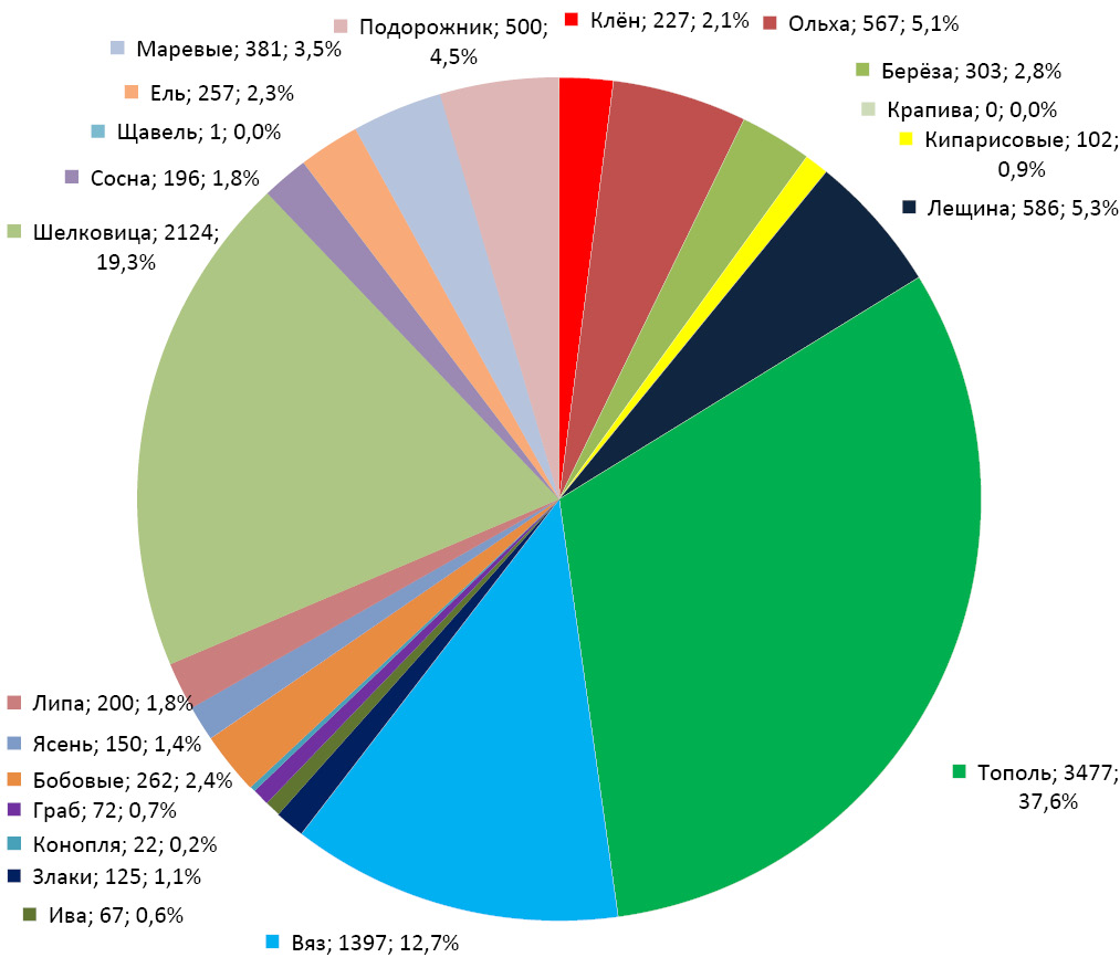 В результате аэропалинологического мониторинга были определены вегетационные периоды цветения растений в г. Ростове-на-Дону в сезон палинации 2019 г. А именно, вегетационный период цветения деревьев (первый пик палинации растений) наблюдался с 07.03.2019 по 31.06.2019 с активным пылением с 10.03.2019 по 29.05.2019. Нами отмечено более сильное пыление тополя (суммарное годовое содержание ПЗ достигало 3477 ПЗ/м3), орешника (615 ПЗ/м3), бука (431 ПЗ/м3), шелковицы (2214 ПЗ/м3 с пиком в мае 2019 г.), вяза (1414 ПЗ/м3), ольхи (577 ПЗ/м3), клена (250 ПЗ/м3), березы (308 ПЗ/м3), сосны и ели (226 и 273 ПЗ/м3 соответственно). Обнаружены таксоны кипарисовых, семейство которых сейчас часто используют в региональном ландшафтном дизайне (127 ПЗ/м3 с пиком в апреле). Кипарис аризонский, или кипарисовое дерево, – вечнозеленое растение, которое часто используется в качестве декоративной посадки в садах, парках и скверах. Также при проведении мониторинга зафиксирована пиковая концентрация пыльцы березы в клинически значимой концентрации – 36 ПЗ/м3 (за весь период вегетации – 222 ПЗ/м3), что является неожиданным в ростовском степном регионе. По данным аэропалинологического исследовательского мониторинга, проводимого в 1971 г., ее концентрация составляла 0 ПЗ/м3 [10]. Удельный вес основных пыльцевых таксонов в первую волну пыления представлен на рис. 2.
