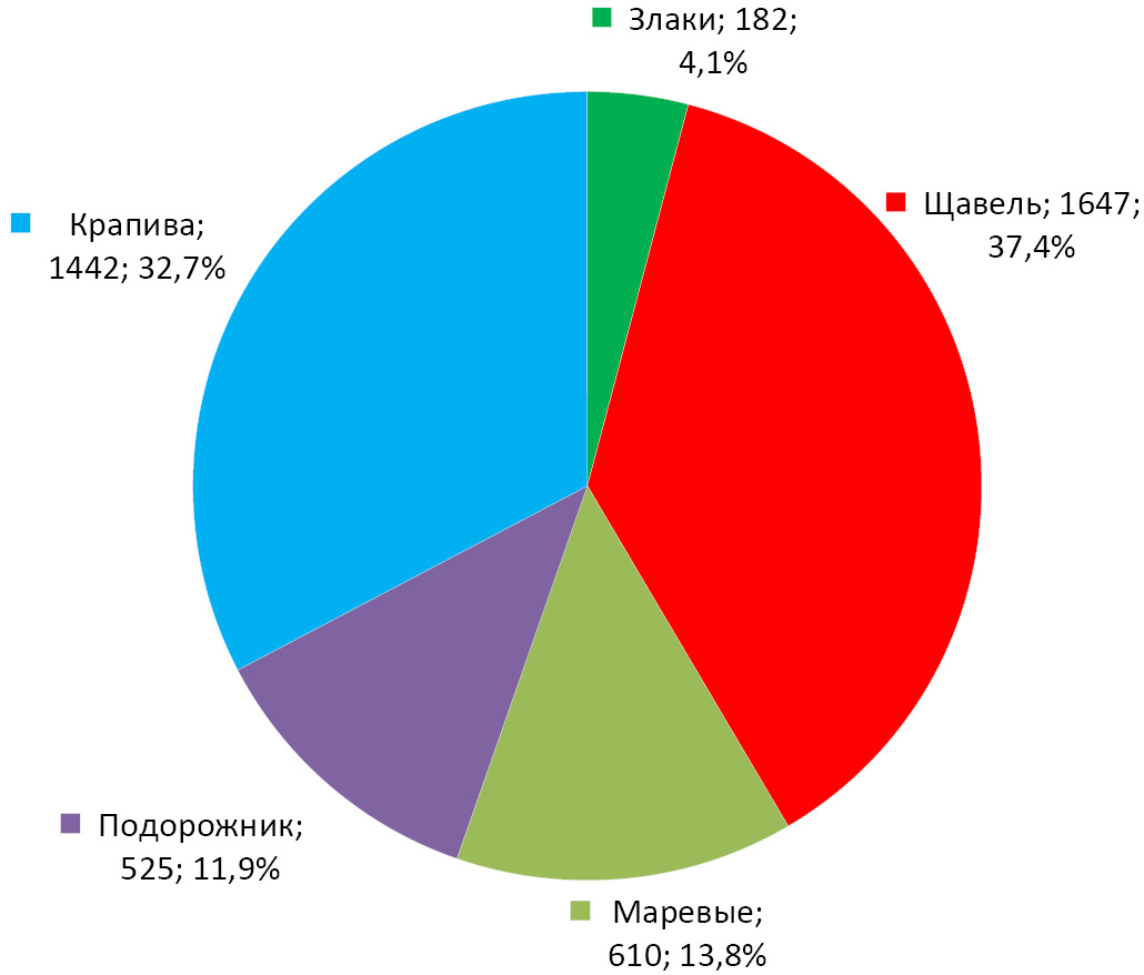 Активность цветения злаковых трав (второй пик палинации растений) в регионе в 2019 г. приходилась на период с 28.04.2019 по 30.07.2019 с длительным периодом вегетации с 02.04.2019 по 14.09.2019, маревые цвели на протяжении 5 мес (с 02.05.2019 по 03.10.2019). В летний период палинации доминировала пыльца крапивы – 32,7%, щавеля – 37,4%, злаков – 4,1%, маревых – 13,8% (рис. 3). Было отмечено раннее пыление злаков, которое началось единично с 28.04.2019 с последующим нарастанием и продолжалось в течение длительного периода – по октябрь. Концентрация маревых наблюдалась с суммарным содержанием пыльцевых зерен в мае – 381 ПЗ/м3 и августе – 472 ПЗ/м3.
