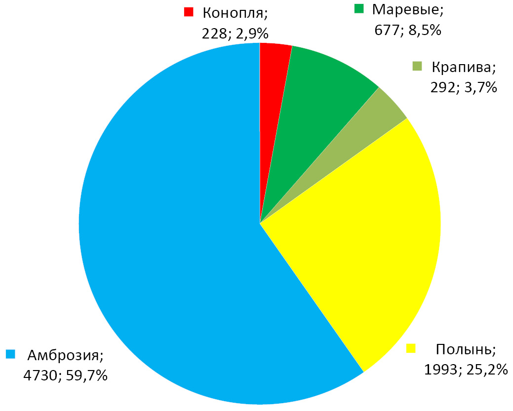 Отчетливо заметным было увеличение пиковой концентрации ПЗ амброзии (393 ПЗ/м3) в сравнении с этими же данными за 1971–1974 гг. (265 ПЗ/ м3). Обнаружение при аэропалинологическом мониторинге ПЗ кипарисовых (за вегетационный период – 127 ПЗ/м3, пик концентрации – в апреле) может быть объяснено изменением ландшафтных традиций в современных условиях.