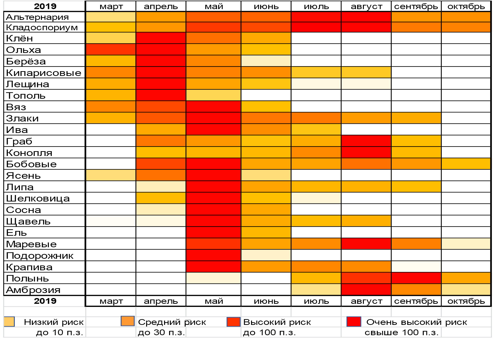 Результаты проведения аэропалинологического мониторинга в г. Ростове-на-Дону в 2019 г. (март-октябрь) включали следующее.