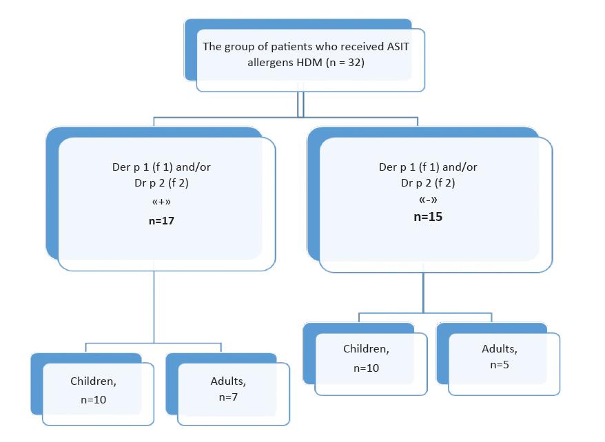 Figure 1. Distribution of AD patients (n=32) who received ASIT with house dust mite allergens, depending on the profile of molecular sensitization and age