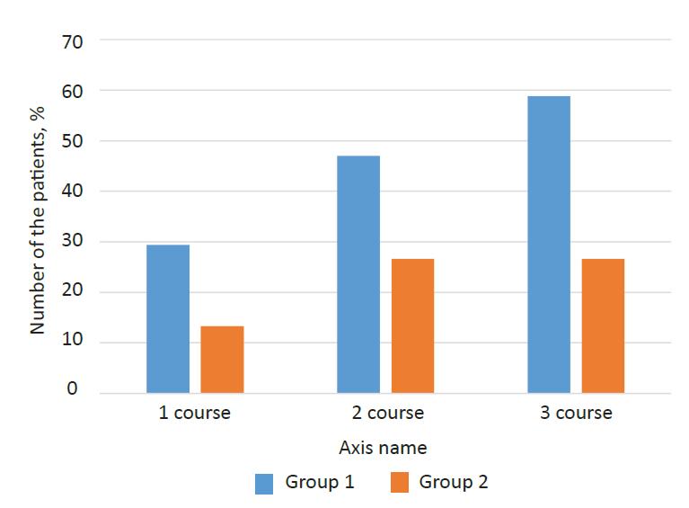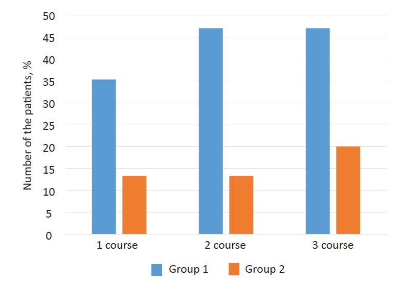 The patient also assessed the effectiveness of the therapy on a 7-point scale, where 5 points were regarded as complete improvement of the condition (100%), and the deterioration of the condition as – 1.
