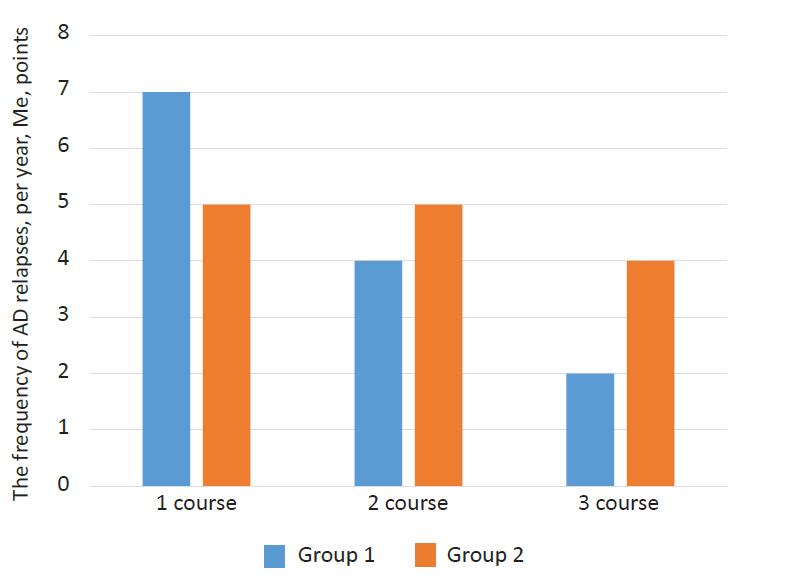 During the three-year period of treatment, most patients showed not only an improvement in the condition of the skin, but also a decrease in the number of relapses of the disease per year. Figure 4 shows the median relapse rates for 1, 2, and 3 years of follow-up in patients of both groups receiving ASIT.