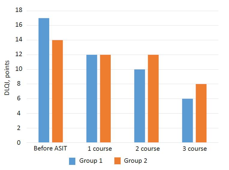 Figure 5. Changes in DLQI (Me) during ASIT in patients of groups 1 and 2