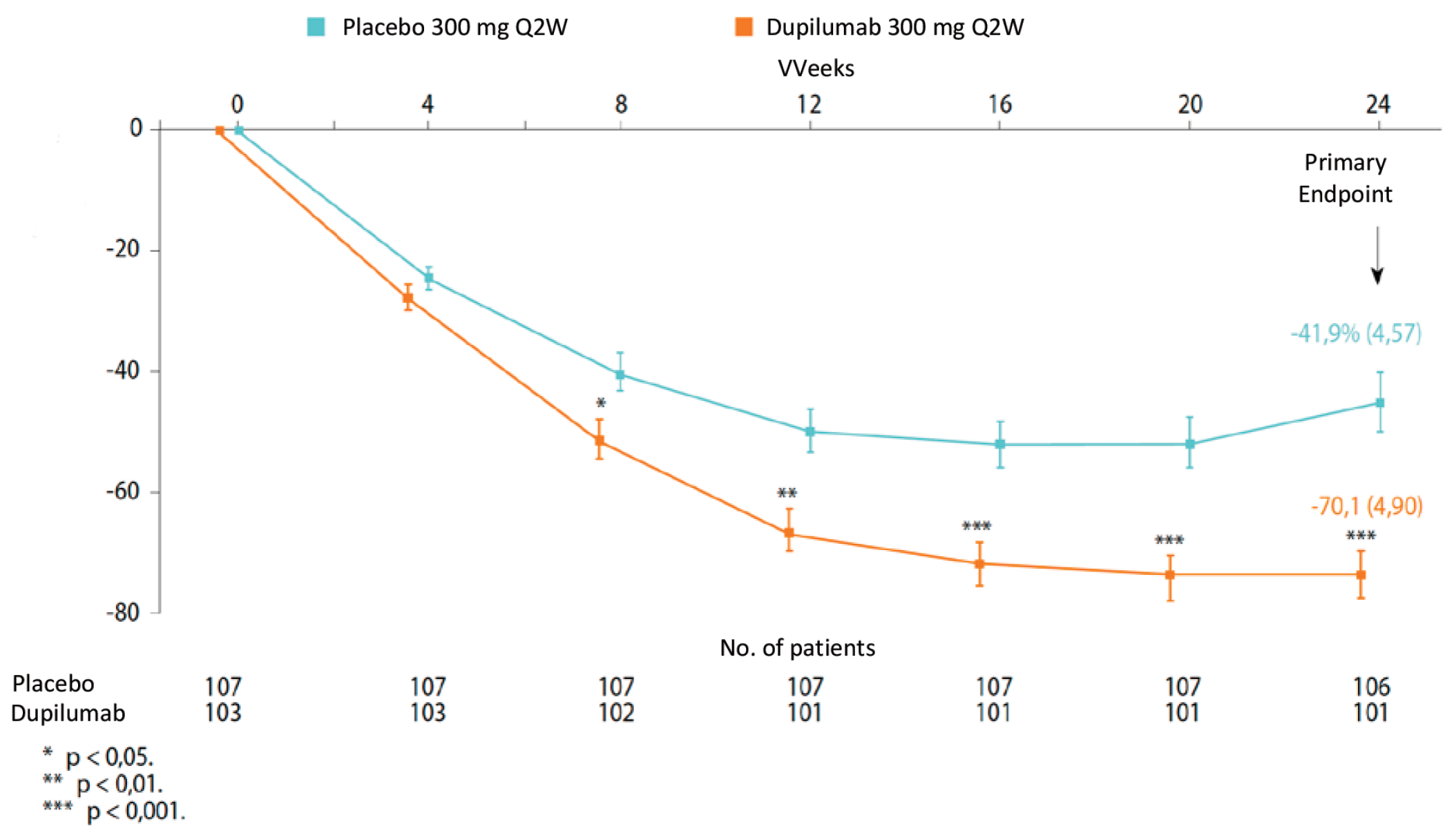 Fig. 6. The study of a steroid-sparing effect (VENTURE): a statistically significant decrease in the need for OCS compared to placebo at week 24 in the general population while using dupilumab (adapted from [31])