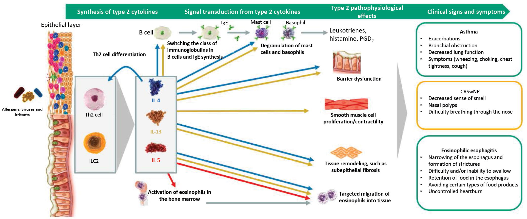 Fig. 1. IL-4 and IL-13 are the main and central type 2 cytokines that determine the pathophysiological mechanisms of the development of T2 inflammation (adapted from Gandhi NA et al., 2017 [16])