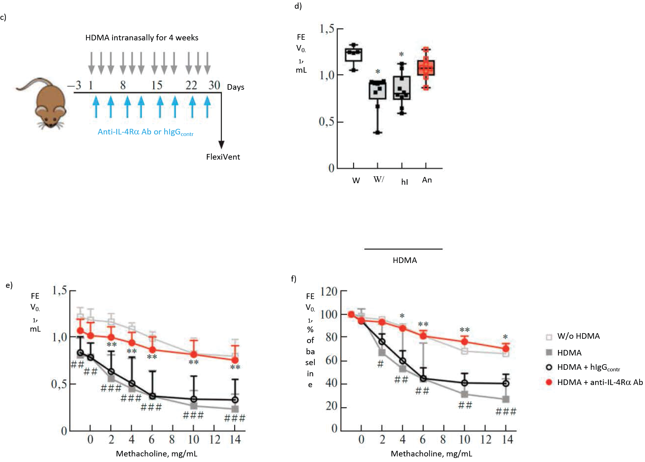 Fig. 2. Dual inhibition of IL-4/IL-13 prevents HDMA-induced impairment of the lung function (c – genetically modified mice were challenged with HDMA or saline for 4 weeks. Two groups of mice exposed to HDMA were subsequently injected with hIgGcontr or anti-IL-4Rα antibodies; d–f – 72–100 h after the last exposure to HDMA, pulmonary function and airway hyperresponsiveness in mice were assessed using negative pressure-driven forced expiratory maneuvers (NPFE) and the forced oscillation technique (FOT) on the FlexiVent platform. After registration of the baseline parameters (d), the mice received increasing doses of methacholine via a nebulizer, for 10 seconds each (0; 2; 4; 6; 10 and 14 mg/mL), after which the functional parameters were measured again (e, f). For each dose of methacholine, FEV0,1 is presented in absolute figures (e) and in relation to the baseline (f) (n≥5 mice in the group); d – * p<0.01 compared with mice that were not exposed to HDMA; e, f – # p<0.1; ## – p<0.01; ### – p<0.001 for mice not exposed to HDMA, compared to mice exposed to HDMA; * – p<0.01; ** – p<0.001 for anti-IL-4Rα antibodies compared to groups treated with IgG control (other significant comparisons not shown), adapted from [29]