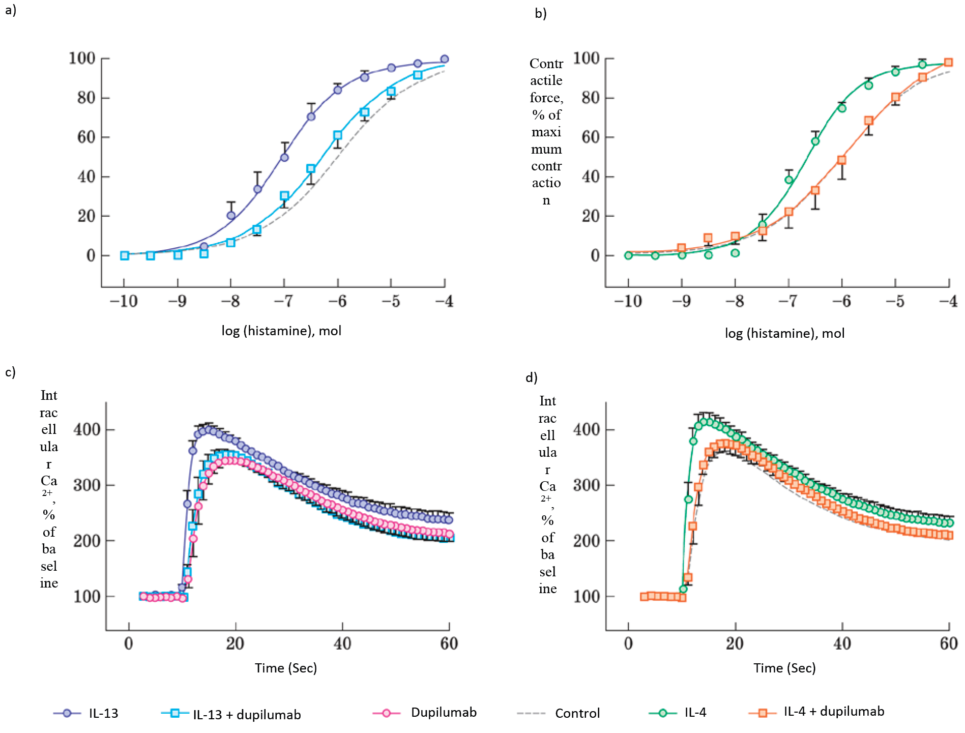 Fig. 3. Effect of dupilumab on BH stimulated by IL-13 and IL-4. Cumulative concentration-response curves were obtained for histamine in human bronchial rings treated for 2 days with IL-13 (a) and IL-4 (b) with and without dupilumab (1 μmol). Statistical comparison of the cytokine pEC50 in human bronchial rings treated with dupilumab and in bronchial segments treated with IL-13 and IL-4 was performed using the paired t-test; a – p<0.01; b – p<0.05. Maximum induction of intracellular calcium by histamine in human airway smooth muscles treated with IL-13 (c) or IL-4 (d) for 24 h with or without dupilumab. Data are presented as mean ± standard error of the mean [32]