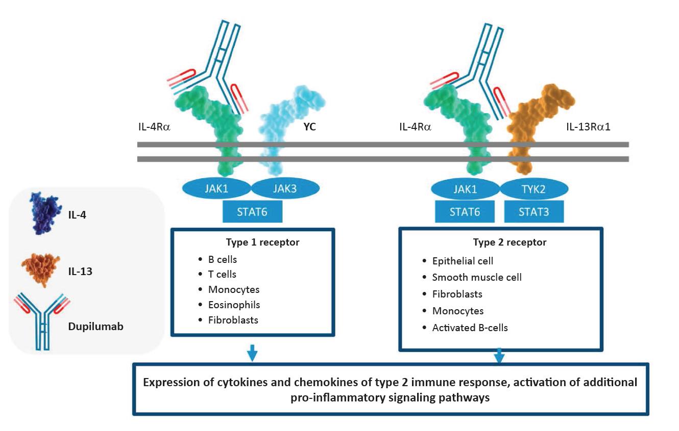 Thus, the experiments carried out showed that dupilumab binds with high affinity to the IL-4Rα subunit, preventing binding of IL-4 and IL-13 to this receptor, which disrupts the signaling pathways of these cytokines, which, in turn, explains the clinical efficacy of the drug for the treatment of T2-inflammation-associated diseases [17, 18, 20, 22, 30, 31]. Since IL-4 and IL-13 simultaneously release due to the interaction between Th2 and APCs, blocking IL-4Rα is more effective than blocking each of these ligands separately [29].