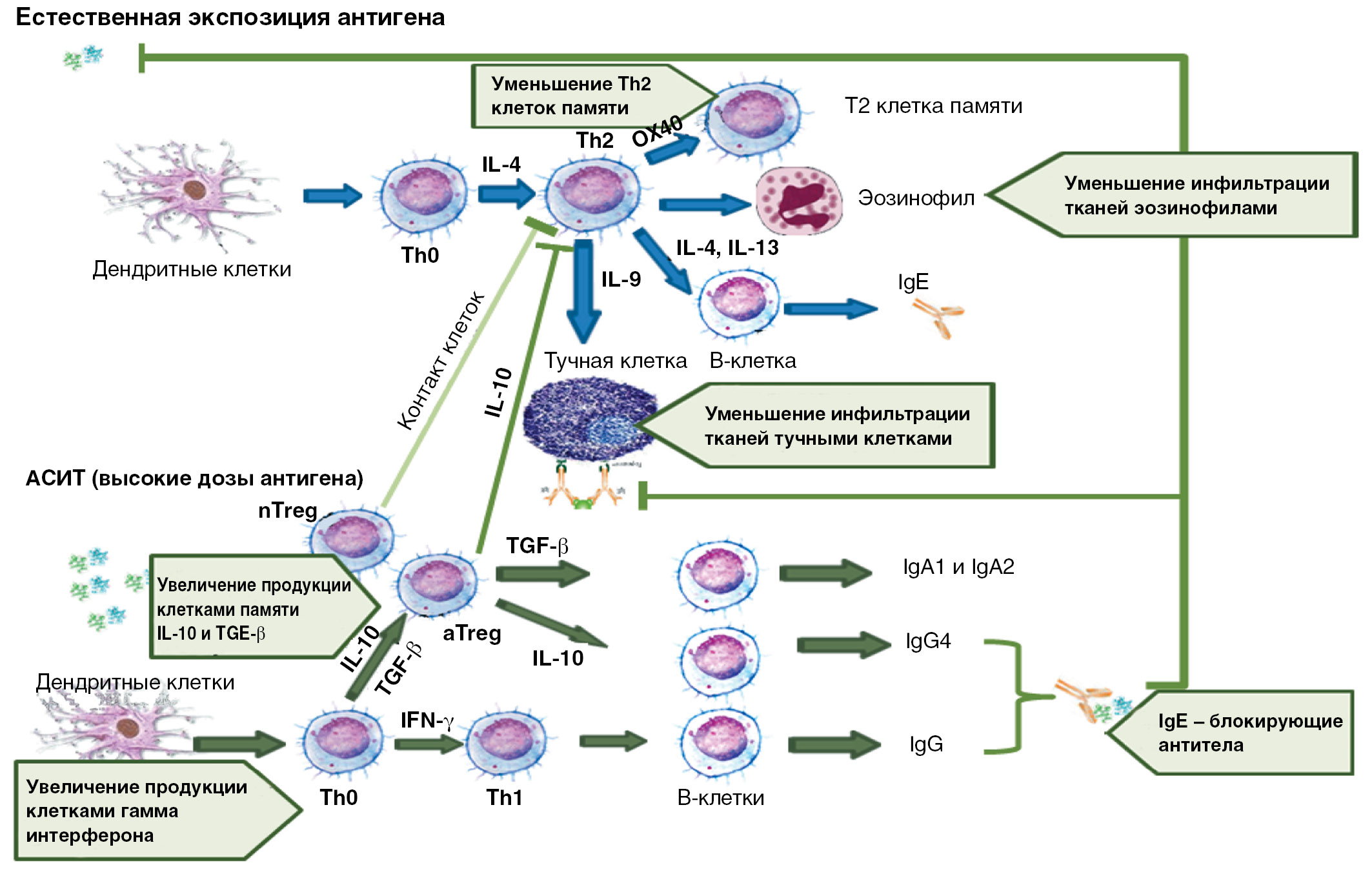 Механизмы АСИТ включают в себя очень ранние эффекты десенситизации, ингибирования миграции и подавление высвобождения медиаторов из эозинофилов, базофилов, тучных клеток [6, 7], модуляцию Т- и В-клеточных реакций и связанных с ними изотипов антител [8, 9, 11, 12].