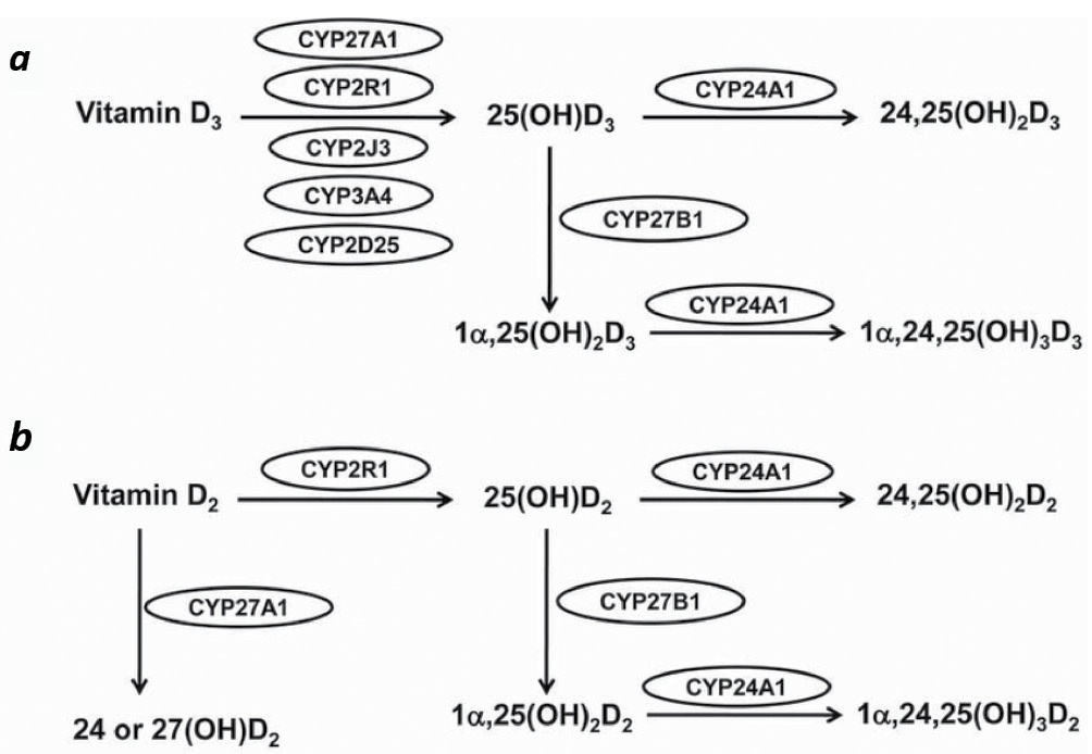 Figure 1. (Vitamin D3 (a) and D2 (b) metabolism with the participation of various cytochrome P450 (CYP) enzymes)