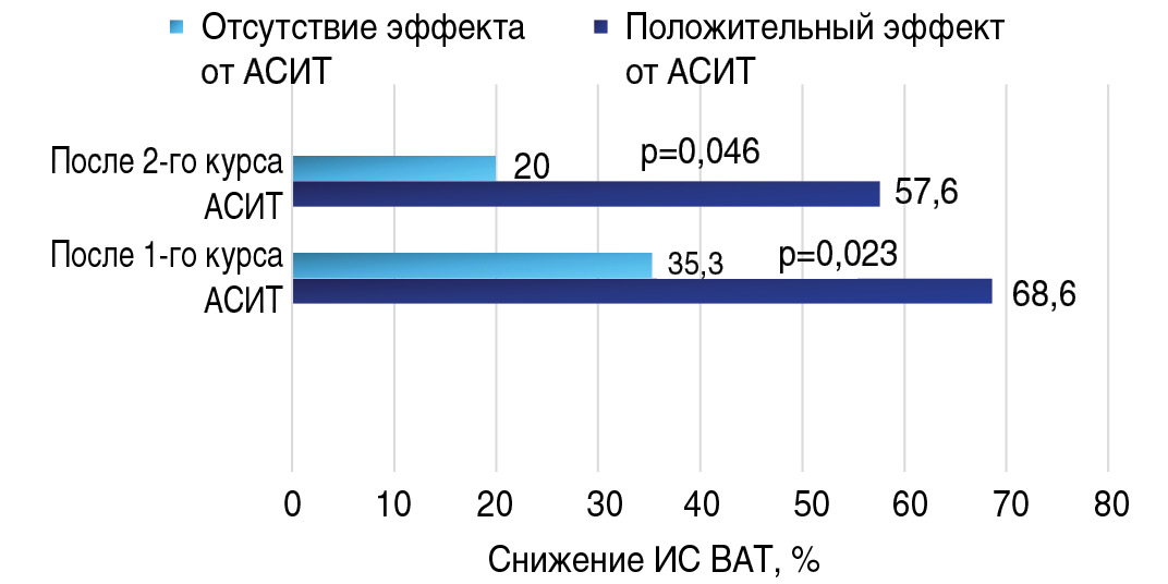 Среди пациентов, имевших положительный эффект после второго курса АСИТ, снижение ИС BAT отмечено в 57,6% случаев, при отсутствии эффекта – только в 20%.