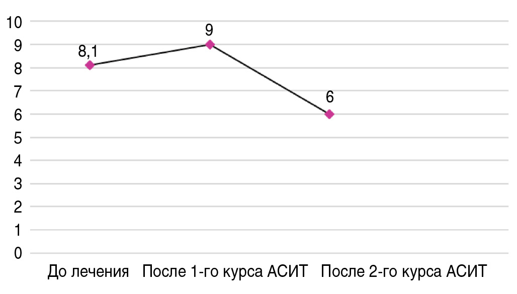 Отличных результатов после первого курса АСИТ удалось достичь у 5,8% больных, хороших и удовлетворительных – у 42,3 и 19,2% соответственно. После 2 лет АСИТ эффективность лечения составила 20,9; 37,2 и 18,6% соответственно. Суммарное количество баллов по шкале RTSS уменьшилось с 13 [10; 15] до 5 [4; 9] баллов после первого курса лечения и до 4,5 [3; 7, 5] – после второго.