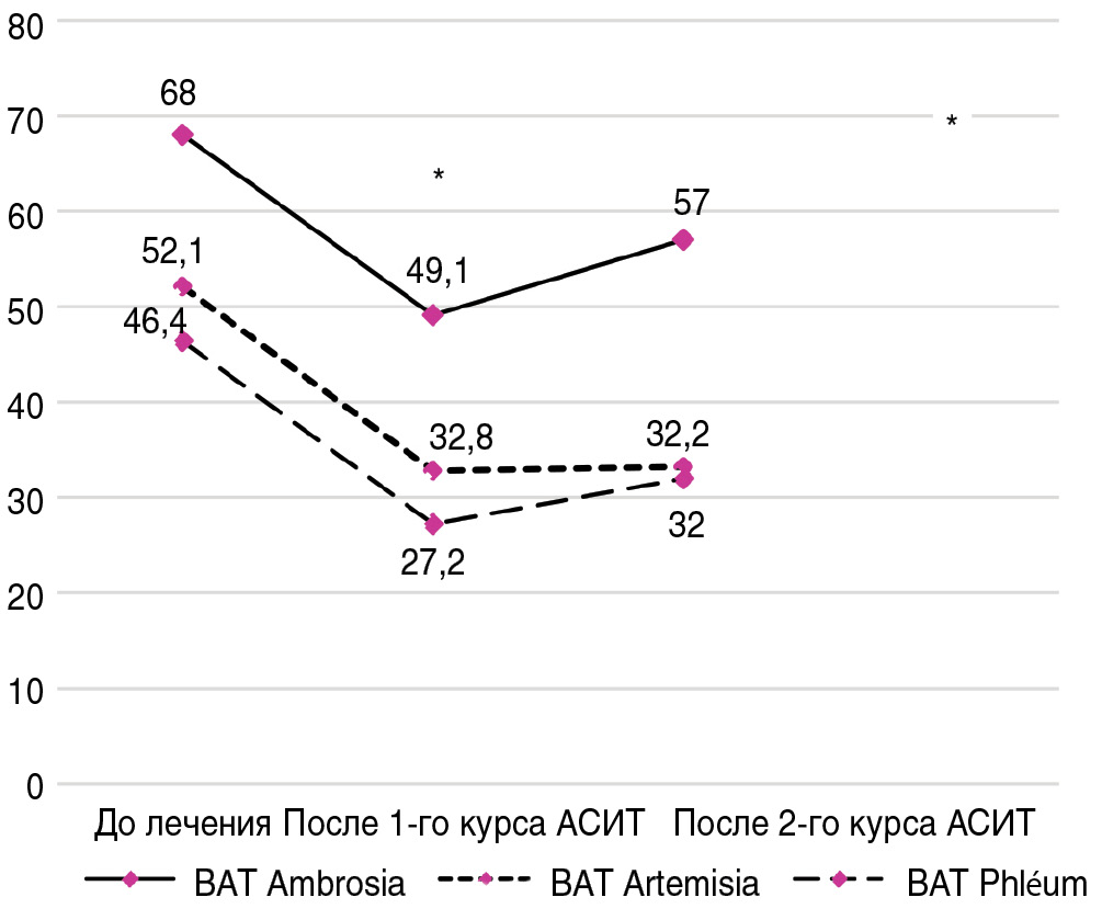 После второго курса лечения их уровни несколько возрастали (BAT Ambrosia – 57 [34; 67], p=0,01, BAT Artemisia – 33,2 [16, 3; 64, 5], BAT Phleum – 32 [11; 32]), однако не достигали значений до лечения. Статистически значимые различия получены только для BAT с аллергеном амброзии, что, вероятно, связано с небольшим объемом выборок пациентов, пролеченных аллергеном полыни и тимофеевки.