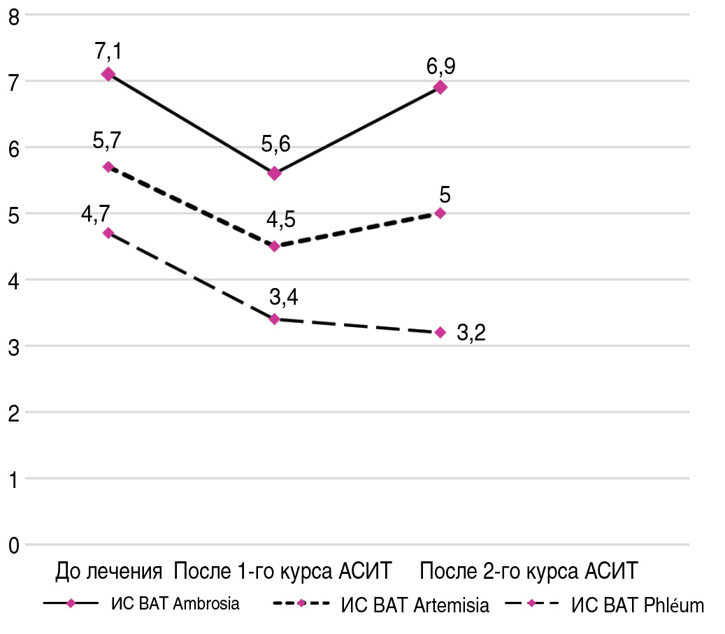 Индексы стимуляции базофилов (ИС BATстим./BATспонт.) имели те же закономерности. Так, ИС BAT Ambrosia до лечения составил 7,1 [3, 2; 13, 2], после первого курса АСИТ – 5,6 [2, 9; 7, 8], p=0,02, после второго – 6,9 [4, 1; 11, 5], ИС BAT Artemisia – 5,7 [2, 1; 11, 4], 4,5 [1, 84; 7, 35], 5 [2, 2; 11, 45], ИС BAT Phleum – 4,7 [2, 1; 10, 5], 3,4 [2, 26; 8, 7], 3,2 [2, 7; 3, 2] соответственно (рис. 4). Однако статистически значимых различий не получено.