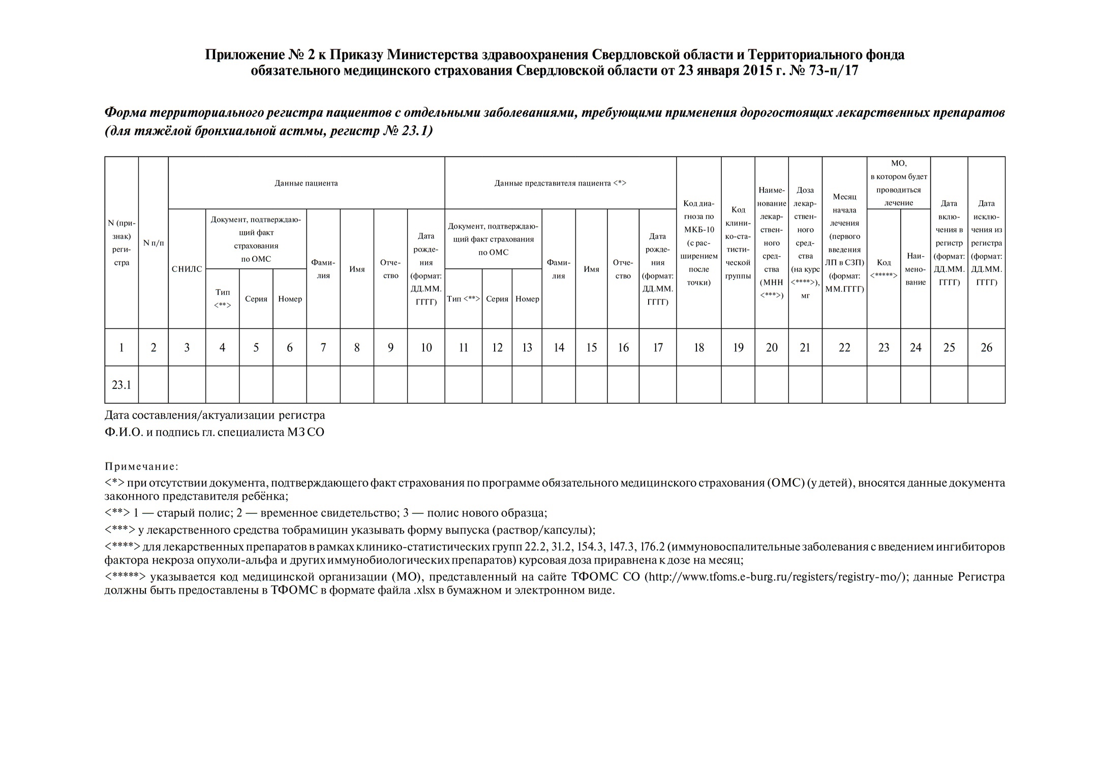 Согласно Приказу МЗ СО и ТФОМС СО от 18.03.2020 № 398-п/1134 были определены медицинские организации, имеющие право проводить ИБТ, и ответственным за формирование и ведение регистра больных ТБА № 23.1 был определён главный внештатный специалист аллерголог-иммунолог МЗ СО, который ежеквартально должен подавать в МЗ СО и ТФОМС СО электронный регистр больных ТБА № 23.1 (для оплаты случаев оказания медицинской помощи), включающий данные пациента (ФИО, СНИЛС, страховой полис), код МКБ-10 (J45.0, J45.1, J45.8), МНН ГИБП, дозу и кратность введения препарата, наименование медицинской организации (приложение № 2 к Приказу МЗ СО и ТФОМС СО от 23 января 2015 № 73-п/17; см. Дополнительная информация).