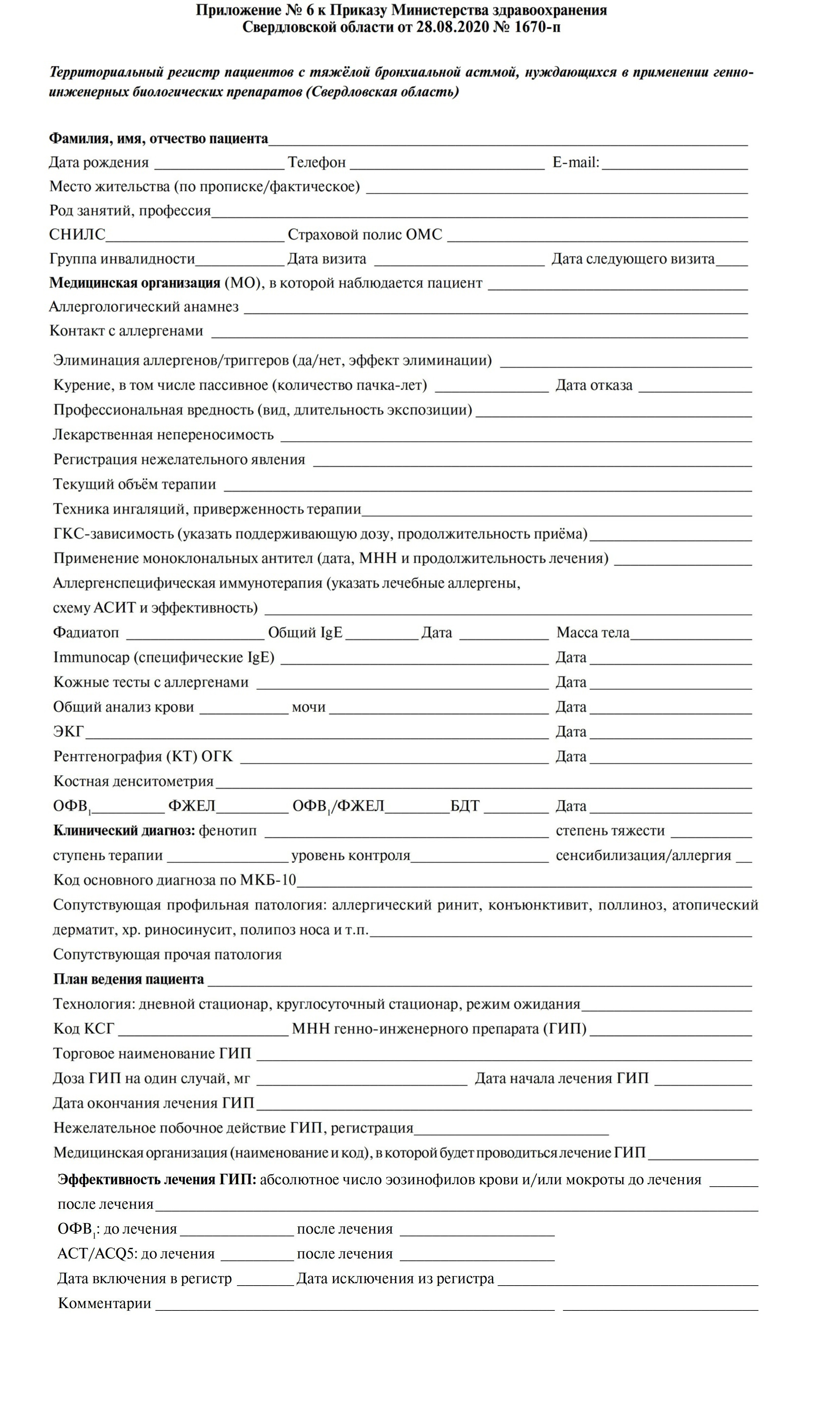 В Приказе МЗ СО от 28.08.2019 № 1670-п «О внесении изменений в Приказ от 24.01.2014 № 64-п «Об организации оказания медицинской помощи взрослому населению Свердловской области по профилю «аллергология и иммунология»»3 был определён перечень муниципальных образований, закреплённых за медицинскими организациями, для оказания специализированной медицинской помощи больным по профилю «аллергология и иммунология», в том числе для лечения ГИБП в условиях дневного/круглосуточного стационара; утверждена форма областного регистра больных ТБА, нуждающихся в применении ГИБП (приложение № 6 к Приказу МЗ СО от 28.08.2020 № 1670-п; см. Приложение), для планирования и мониторинга эффективности ИБТ. Данный регистр больных ТБА включает краткие данные анамнеза заболевания, аллергологического и инструментального исследований, клинический диагноз с указанием фенотипа, степени тяжести, уровня контроля бронхиальной астмы, сопутствующих заболеваний, план ведения пациента (ИБТ в дневном/круглосуточном стационаре или режим ожидания ИБТ) и оценку эффективности лечения (функция дыхания и уровень контроля астмы). С учётом рекомендаций Европейской академии аллергологии и клинической иммунологии (European Academy of Allergy and Clinical Immunology, EAACI; 2020) данный регистр больных ТБА для оценки эффективности биологической терапии целесообразно расширить, включив тяжёлые обострения астмы, качество жизни и безопасность ИБТ [8].