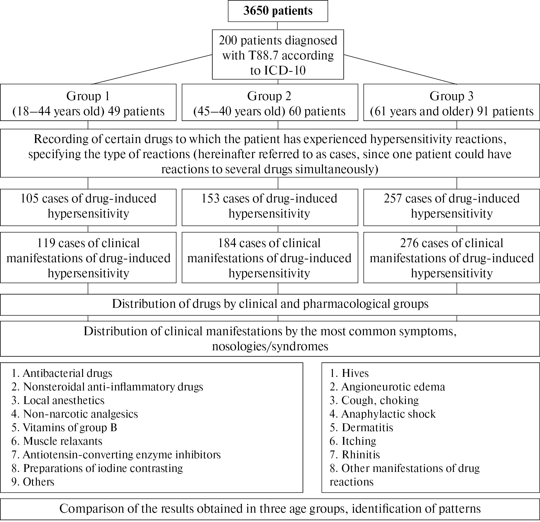 The aspects of drug-induced hypersensitivity were revealed in patients of different age groups, namely in young patients (18–44 years old), middle-aged patients (45–60 years old), elderly and senile patients (61 years and older).
