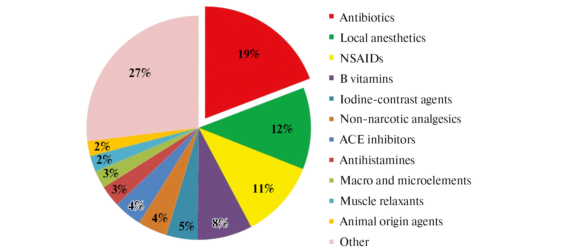 A total of 515 drugs were identified, which induced adverse reactions. Further, we distributed them into 33 groups according to the clinical and pharmacological classification. We selected 11 groups (in decreasing incidence) of them, which were antibiotics (19.19%), local anesthetics (11.82%), nonsteroidal anti-inflammatory drugs (11.24%), B vitamins (7.95%) , iodine preparations (4.46%), ACE inhibitors (4.07%), antihistamines (3.1%), macro and microelements (2.52%), muscle relaxants (2.33%), animal origin products (2.13%). The others (26.94%) included drugs whose incidence of reactions was less than 2% (Table 5; Fig. 3).