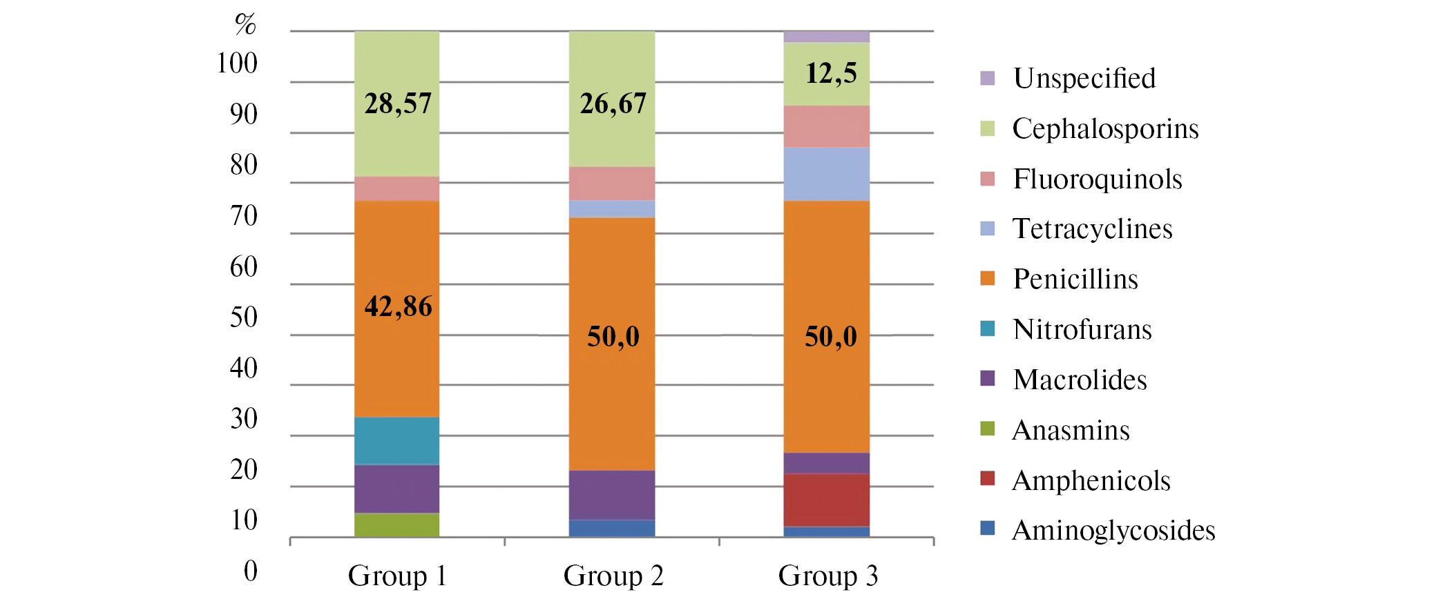 Among antibiotics, in terms of incidence of drug-induced hypersensitivity reactions in all age groups, the leading positions were taken by drugs of the penicillin series (42.86% in the group 1; 50% in the group 2; 50% of the subjects in the group 3) and cephalosporins (28.57% in the group 1, 26.67% in the group 2, and 12.5% of patients in the group 3) (Fig. 4; Table 4). A similar distribution of antibiotic groups is noted in patients from the general sample (48.48% of penicillins and 20.2% of cephalosporins).