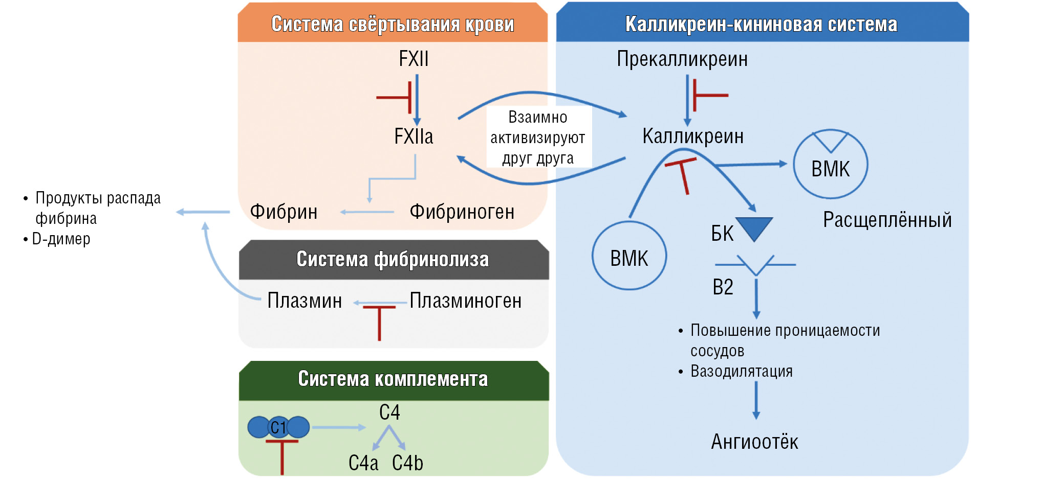 С1-ингибитор ― сериновая протеаза, которая принимает участие в регуляции работы следующих систем: системы комплемента, калликреин-кининовой системы, системы свертывания крови по внутреннему пути, фибринолитической системы [8]. Наибольшее значение имеет влияние фермента на калликреин-кининовую систему (рис. 1): в отсутствии С1-ИНГ и/или при снижении его функциональной активности (фаС1-ИНГ) происходит неконтролируемое превращение прекалликреина в калликреин, под воздействием которого расщепляется высокомолекулярный кининоген с образованием БК. Этот эффект усиливает активизация XII фактора свёртывания крови (FXII) в результате запуска свёртывания крови по внутреннему механизму, так же обусловленному отсутствием и/или нарушением функциональной активности С1-ИНГ [9–11].