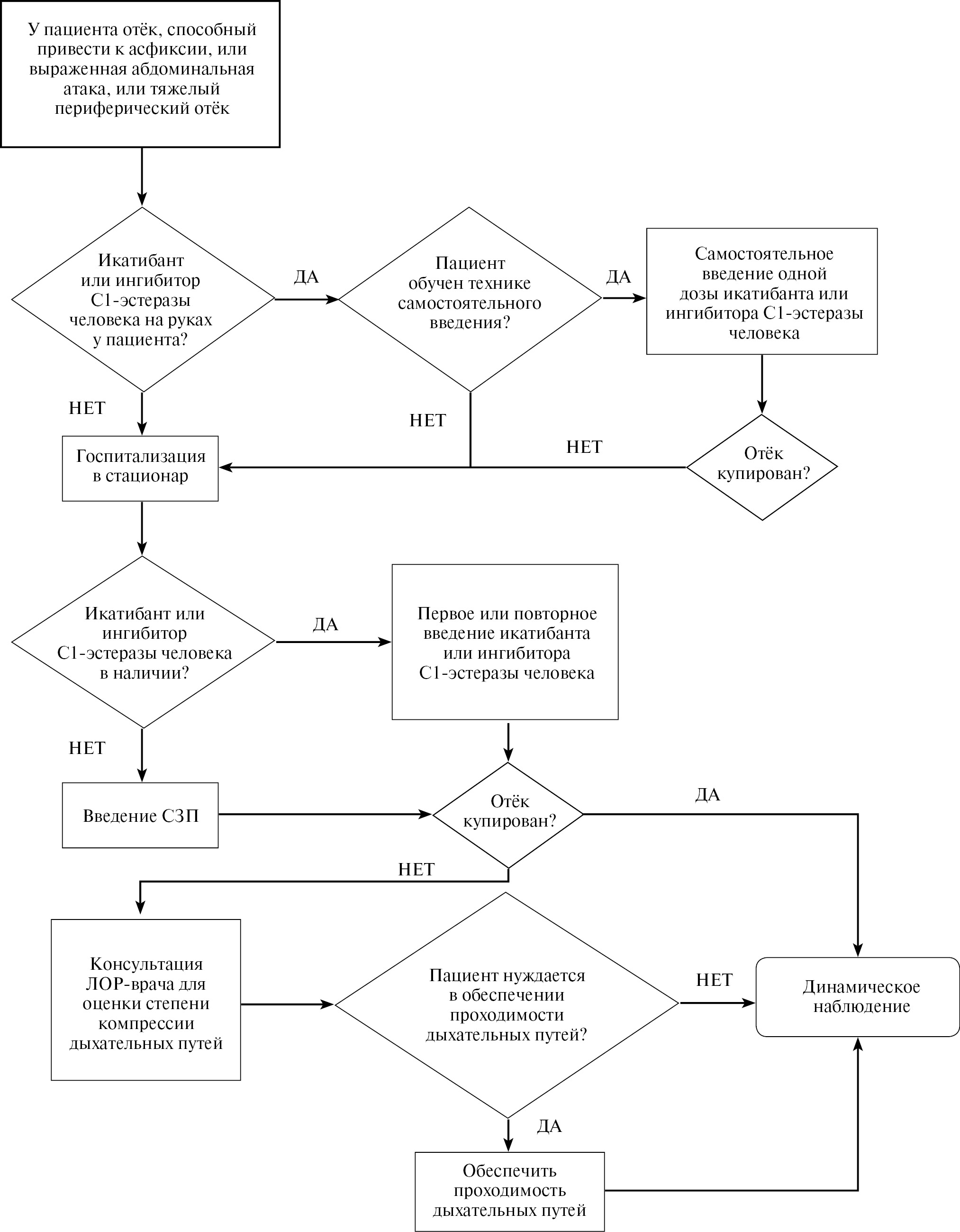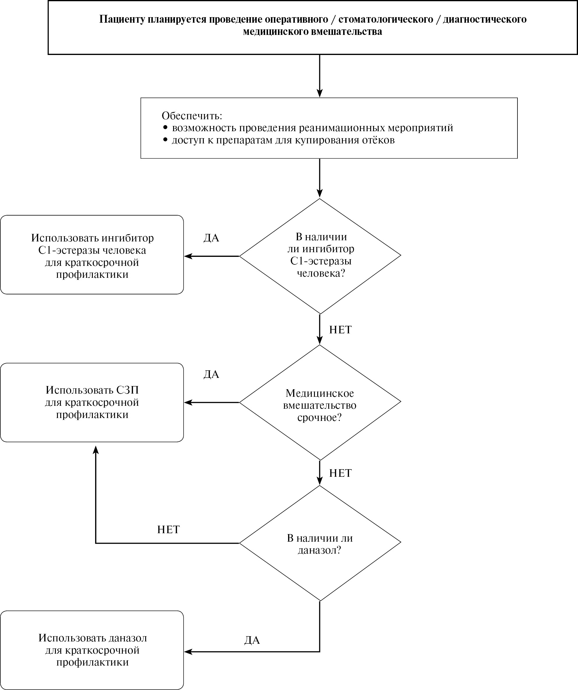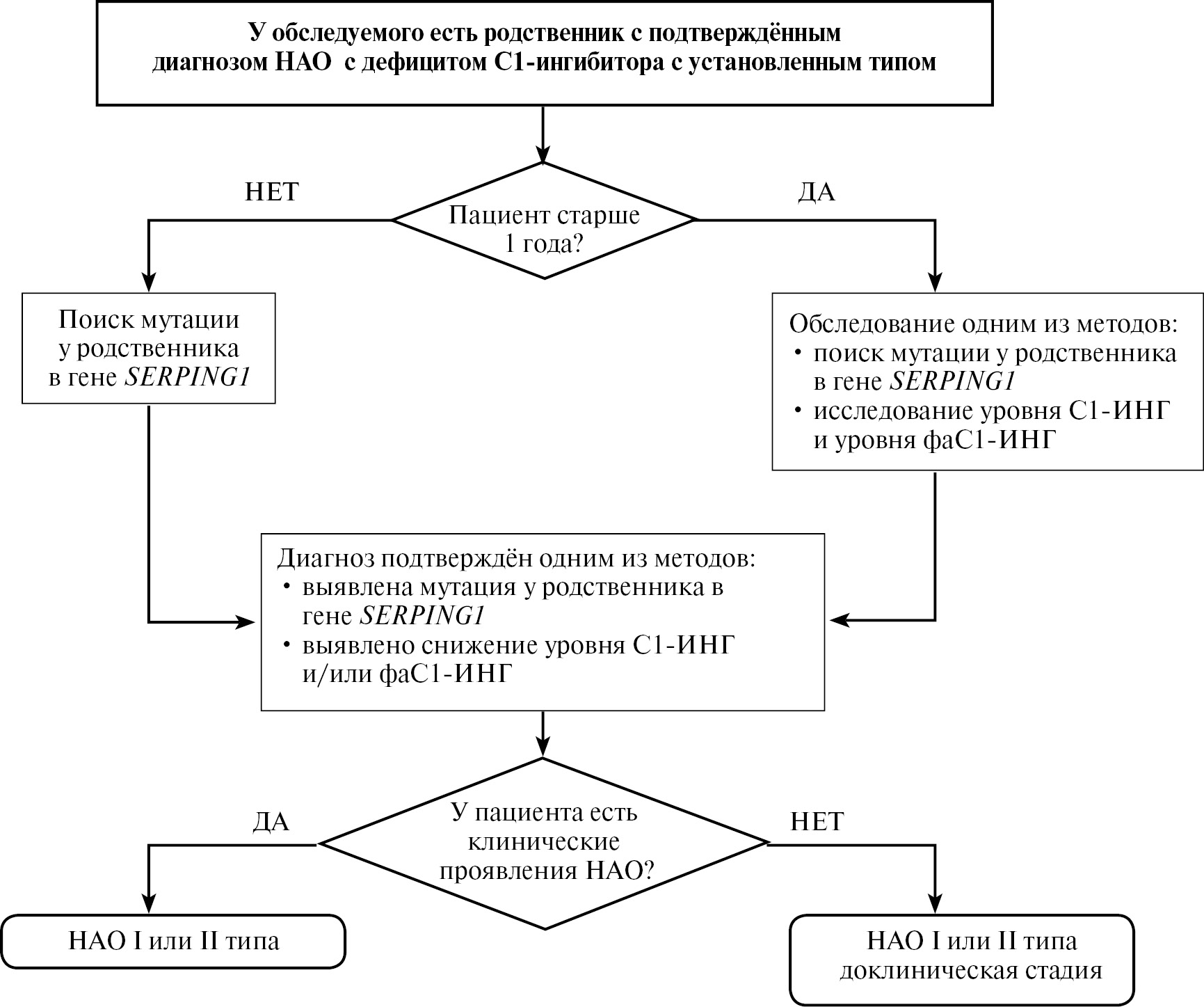 Диагностические критерии для первого обследуемого пациента в семье | ≥1 критерия: • рецидивирующие периферические АО • рецидивирующие абдоминальные атаки • АО верхних дыхательных путей Дополнительный критерий: семейный анамнез и диагностически значимое снижение С1-ИНГ или его функциональной активности (при нормальном или повышенном уровне С1-ИНГ) и ≥1 критерия: • диагностически значимое снижение С1-ИНГ или его функциональной активности (при нормальном или повышенном уровне С1-ИНГ) при повторном исследовании • выявление причинно-значимой мутации с доказанной патогенностью в гене SERPING1 | ≥1 критерия: • рецидивирующие периферические АО • рецидивирующие абдоминальные атаки • АО верхних дыхательных путей Дополнительный критерий: семейный анамнез и уровни С1-ИНГ и его функциональной активности в двух исследованиях не снижены, или их снижение диагностически незначимо. и ≥1 критерия: • наличие семейного анамнеза • выявление причинно-значимой мутации с доказанной патогенностью в одном из генов: плазминогене, XII факторе свёртывания крови, ангипоэтине-1 |