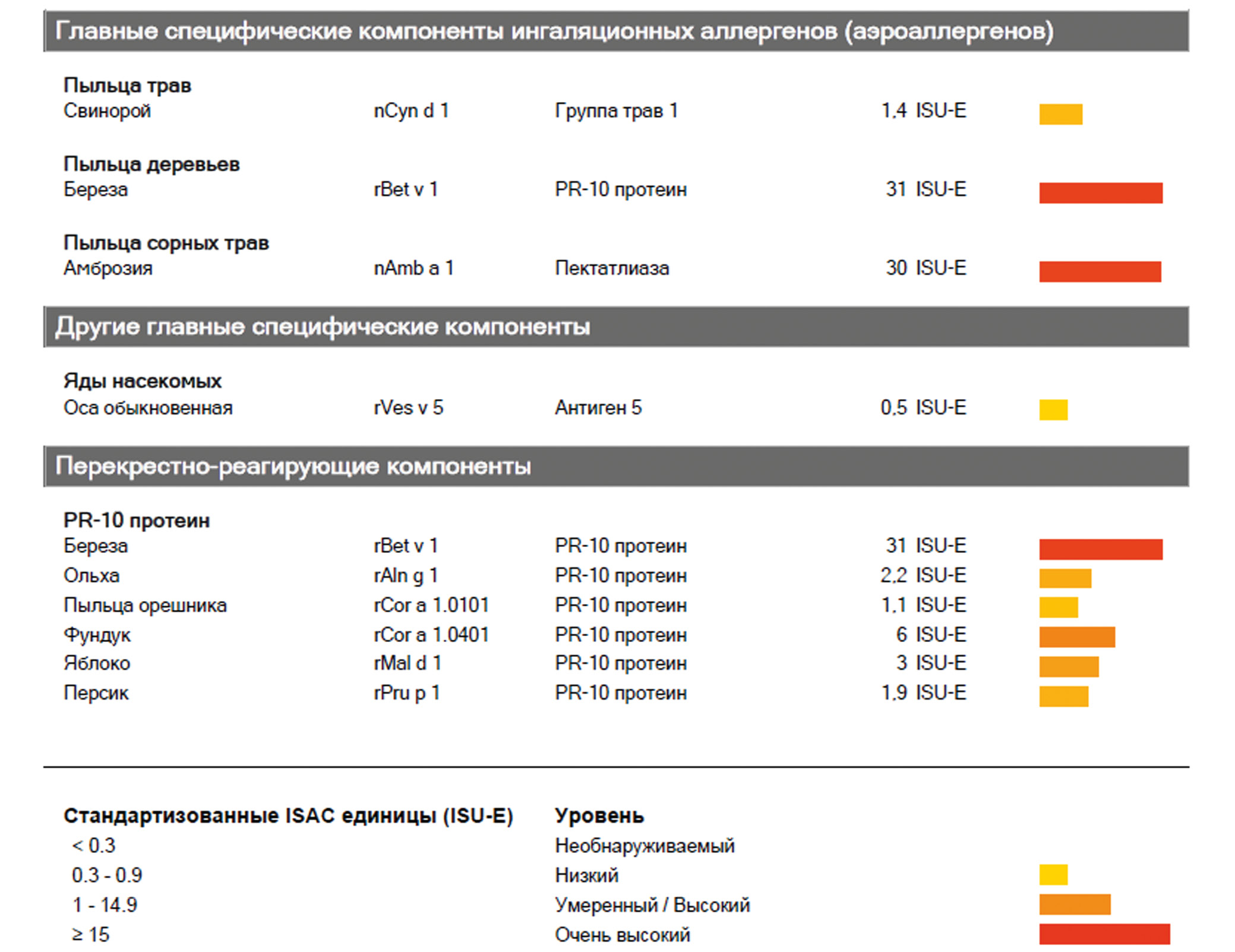 Данные объективного осмотра и лабораторно-инструментальное исследование. Общее состояние удовлетворительное. Адекватен, спокоен, контактен. Отёков и сыпи нет. Рост 172 см, масса тела 76 кг. Склеры инъецированы, влажные. Периферические лимфатические узлы не увеличены. Носовое дыхание симметрично затруднено. Аксиллярная температура тела 36,6°С. В лёгких дыхание по всем полям везикулярное, хрипов нет. Частота дыхательных движений (ЧДД) 18 в мин. Тоны сердца ясные, ритм правильный. Частота сердечных сокращений (ЧСС) и пульс 65 в мин. Артериальное давление 112/80 мм рт.ст. При кожном тестировании выявлена сенсибилизация к пыльце берёзы, лещины, ольхи, амброзии. Клинический анализ крови в норме. Эозинофилии нет. IgE общий 263,70 МЕ/мл. Аллергочип ― 112 аллергенов (рис. 1).