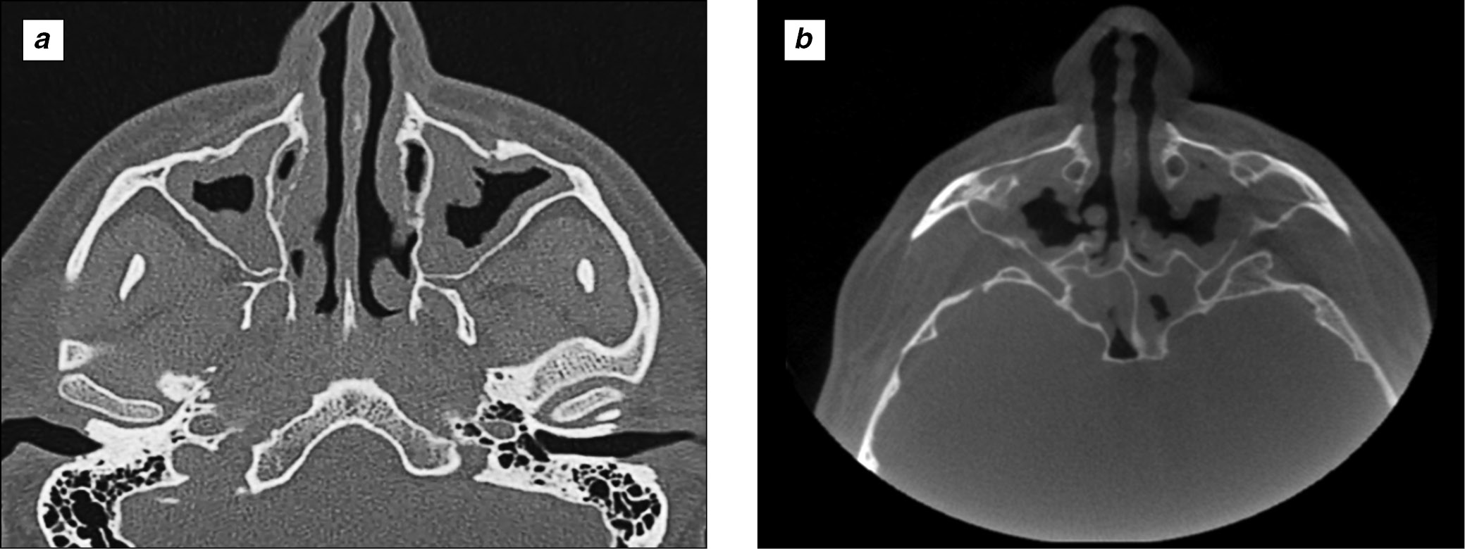 Рис. 2. Динамика симптомов полипозного риносинусита по данным компьютерной томографии околоносовых пазух (сентябрь 2018 – сентябрь 2020 г.): a ― снимок после проведённой эндоскопической полисинусотомии в сентябре 2018 г. (полипозные разрастания в верхнечелюстных, клиновидных пазухах, в клетках решётчатого лабиринта); b ― снимок через 24 мес от старта анти-IgE-терапии (сохраняется только пристеночное утолщение слизистой оболочки в верхнечелюстных, клиновидных пазухах, в клетках решётчатого лабиринта с восстановлением воздушности в околоносовых пазухах)