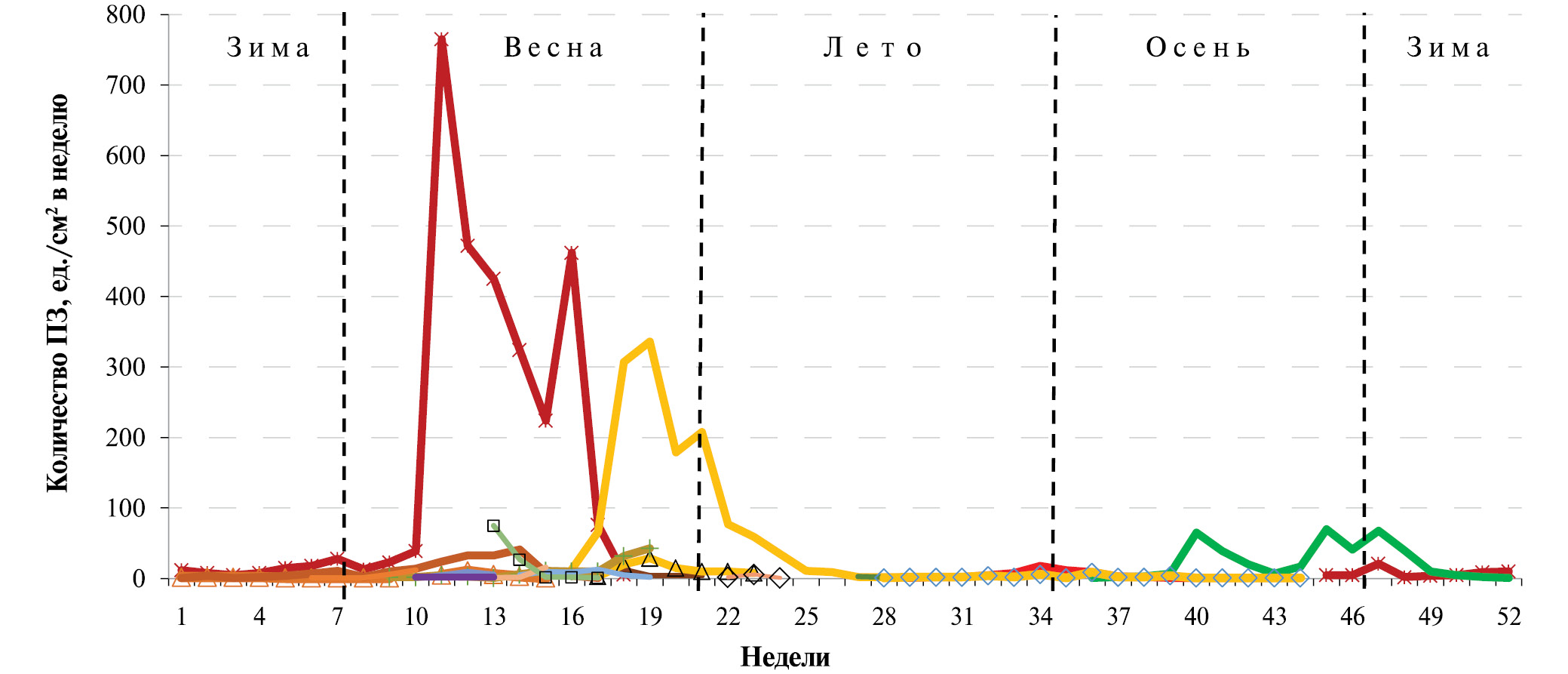 Fig. 2. Average annual dynamics of plant pollen content in the air of Yalta in 2011–2013, PG/cm2 per week.