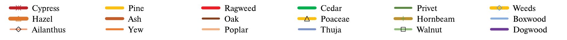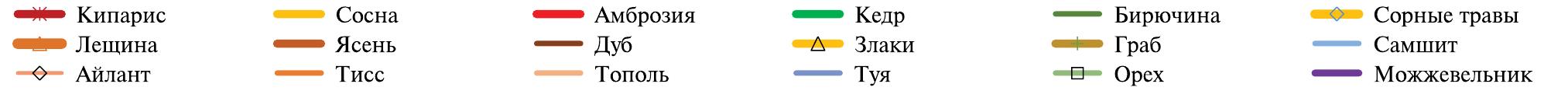 Plant pollination in Yalta was naturally wavy. Wave 1 include tree pollination from mid-autumn to mid-summer (cedar in September to February; cypress in November to early May; hazel, ash-tree, yew, cornel tree, juniper, arborvitae, poplar, and walnut in January to April; hornbeam and boxtree in March to early May; and pine, oak, ailanthus, and privet in late April to mid-July). Wave 2 was mild due to the rapid drying or oppression of grasses during the drought period and include poaceae pollination in late April to early June. Wave 3, which is also mild, include weeds pollination from mid-July to early November (Fig. 2).