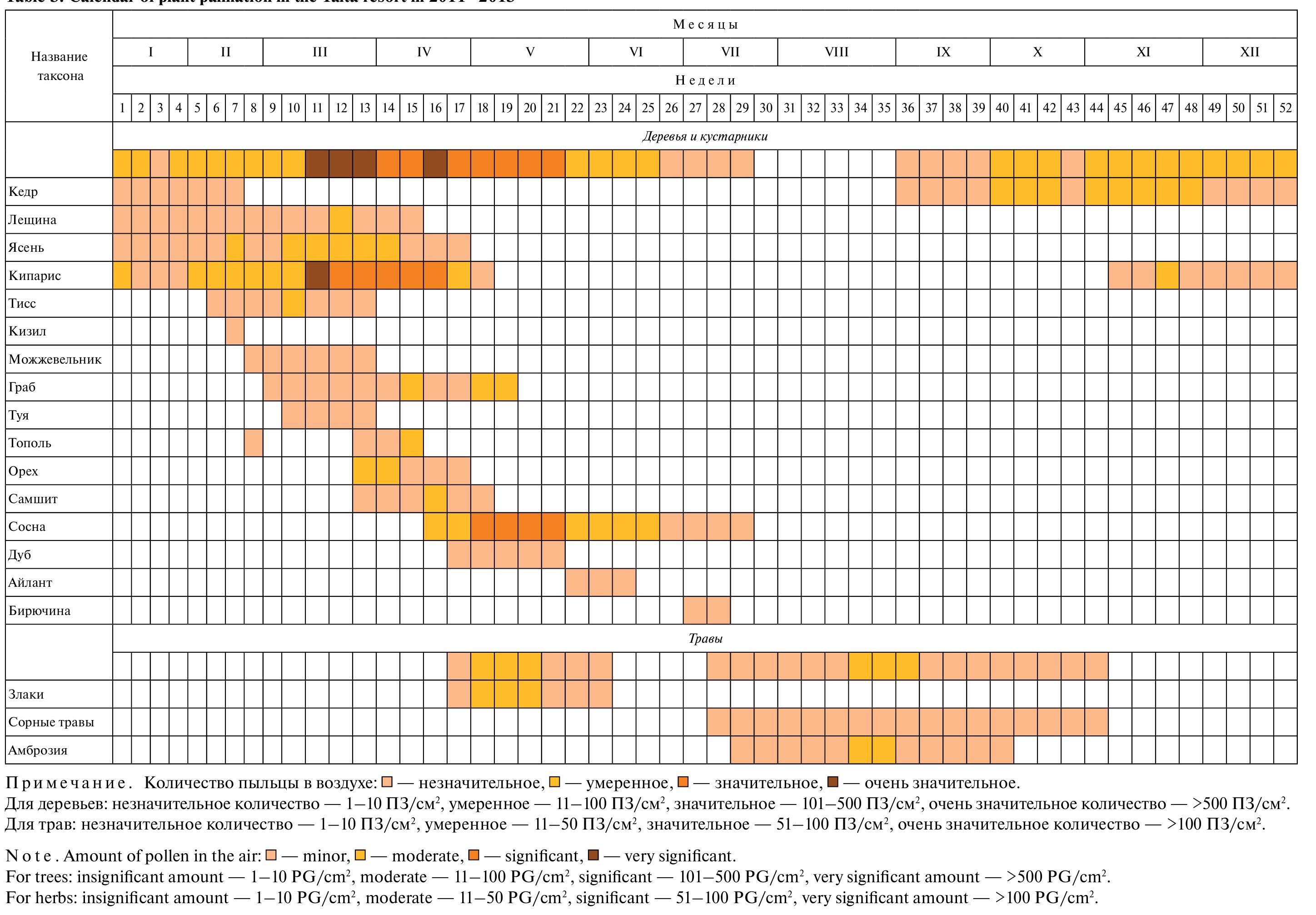 The pollination calendar was drawn up in a table based on the obtained aeropalinological study results in the coastal and foothill regions and averaged over the entire monitoring period for the city as a whole.