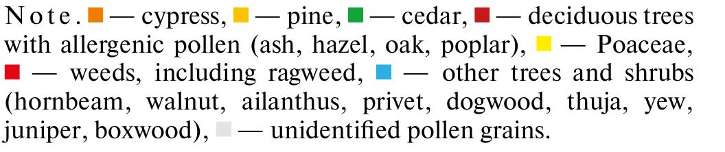 During the study period, in addition to unidentified PG (UPG), plant pollens of 19 taxa was found in the air of the Yalta resort, namely conifers (cypress [Cupressus], American arborvitae [Thuja occidentalis], juniper [Juniperus], pine [Pinus], cedar [Cedrus], and common yew [Taxus baccata]), deciduous trees and shrubs (ash-tree [Fraxinus], hornbeam [Carpinus], walnut [Juglans regia], common hazel [Corylus avellana], oak [Quercus], poplar [Populus], common privet [Ligustrum vulgare], highest tree of heaven ailanthus [altissima], cornel tree [Cornus mas], boxtree [Buxus colchica]), herbs (poaceae [Poaceae], hogweed [Ambrosia], and weeds) (Table 1). Tree and shrub pollen prevailed (84.2% of the identified taxa and 88.8% of the average annual total PGs), mainly of conifers (79.3% of the average annual amount) such as cypress, pine, and cedar. The number of PGs of deciduous trees and shrubs as producers of pollen with sensitizing properties (ash-tree, hazel, oak, and poplar) amounted to 4.7% of the average annual amount, whereas 3.2% in herbaceous plants (poaceae and weeds, including hogweed) (Fig. 1).