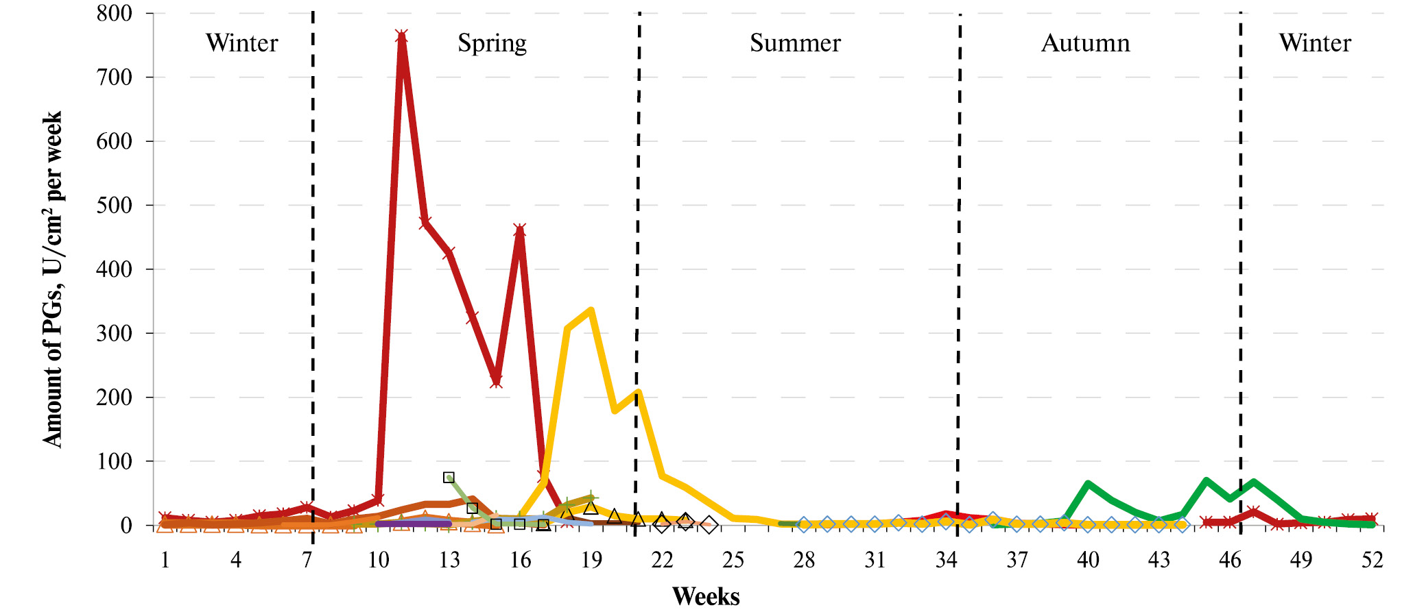 The taxonomic affiliation of PGs was identified using a preliminarily created collection of plant pollen [6]. Due to the significant morphological similarity of PGs of closely related species, their taxonomic affiliation in most cases was determined to the genus, and in some cases, to the family.