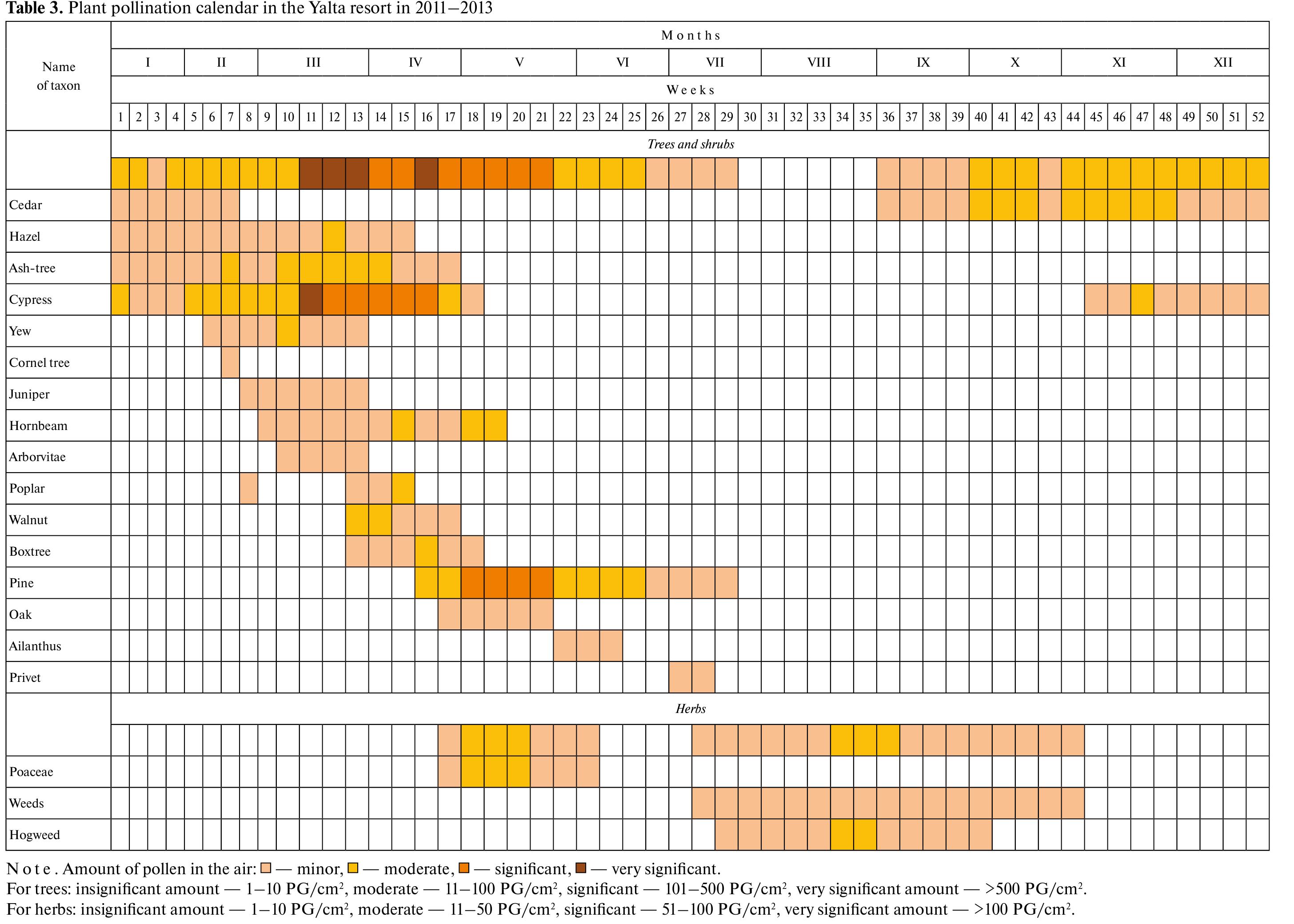 Table 3. Plant pollination calendar in the Yalta resort in 2011–2013