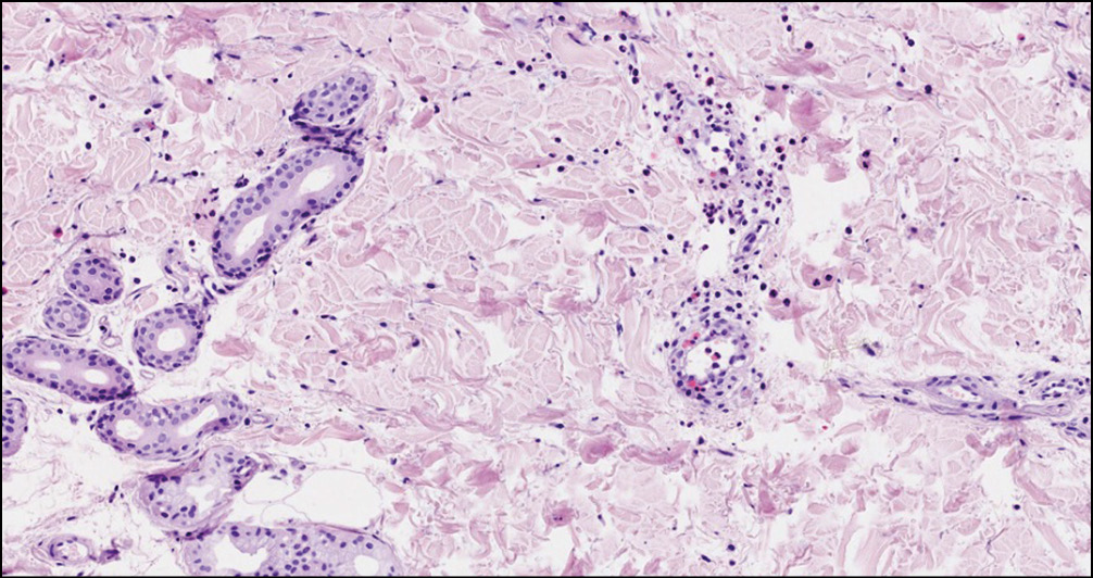 Рис. Окрашенный срез биопсии кожи. Эпидермис обычной толщины, его слои дифференцированы, слабый рыхлый кератоз. Стенки сосудов сосочкового и сетчатого слоёв дермы утолщены за счёт отёка и набухания эндотелиоцитов. Вокруг сосудов слабая инфильтрация из гистиоцитов, лимфоцитов, эозинофильных гранулоцитов. Местами единичные эозинофильные лейкоциты проникают в сосудистую стенку. Количество эозинофилов ― от 7 до 12 в поле зрения при увеличении в 400 раз. Изменения соответствуют уртикарному васкулиту.