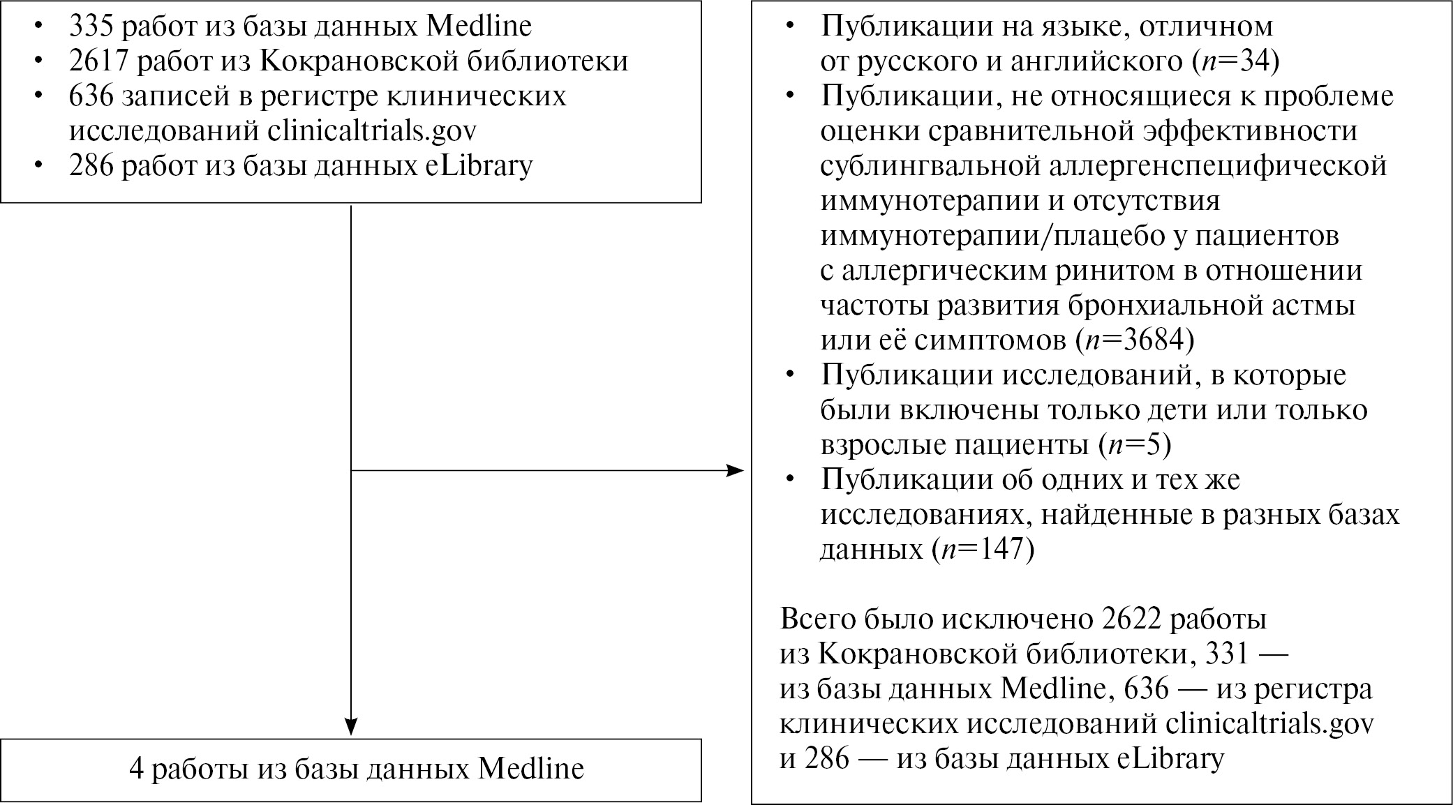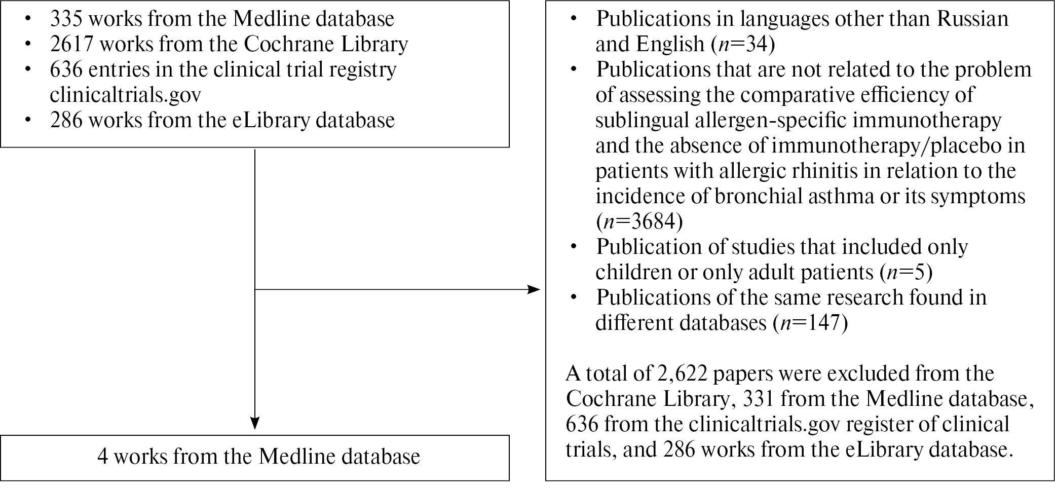 Inclusion criteria were the study of the efficiency of sASIT in any dosage form compared to standard pharmacotherapy in a mixed population of pediatric and adult patients with AR or rhinoconjunctivitis. An assessment of the effects of sASIT on BA incidence was to be used as one of the criteria for assessing clinical efficiency. The clinical trial had to be comparative, and the type and language of the publication were not exclusion criteria. A strict exclusion criterion was the baseline presence of BA in all or some of the study participants. The systematic search was performed independently by two researchers. Study selection and data extraction were also conducted independently by two researchers, and in cases of disagreement, a consensus was achieved with the involvement of a third researcher.