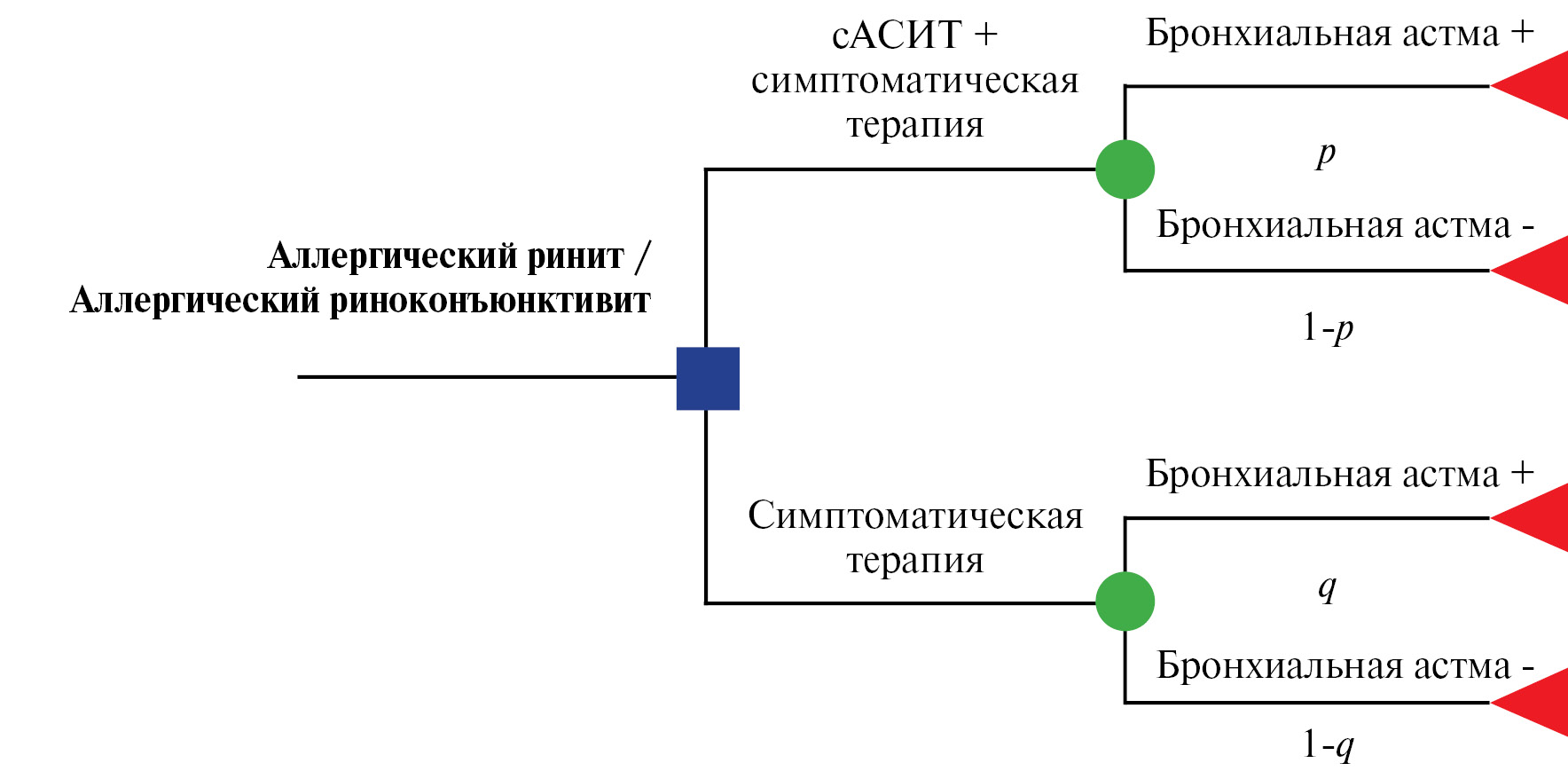 MATERIALS AND METHODS: The study hypothesized based on study results by Devillier P. et al. in 2019, to which the incidence of asthma was 13.7% and 17.0% in the sublingual allergen-specific immunotherapy + symptomatic therapy and the symptomatic therapy group, respectively (odds ratio: 0.776, 95% confidence interval [0.622; 0.968]). Pharmacoeconomic study based on decision tree model. Costs taken into account are the following: allergen-specific immunotherapy, symptomatic therapy, diagnostics, and routine follow-up visits due to bronchial asthma, outpatient bronchial asthma drug therapy, and hospitalization due to bronchial asthma. The modeling horizon was 5 years, including 2 years of allergen-specific immunotherapy therapy and 3 years of follow-up.